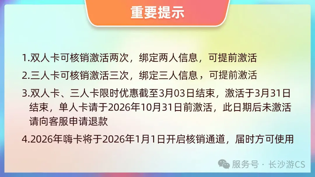 关注“长沙游CS”服务号,点击城市嗨卡菜单栏,进入长沙城市嗨卡(2026版)查看权益,点击激活,按流程操作即可。(温馨提示:长沙城市嗨卡是使用持卡者本人身份证实名认证的电子激活卡,预售期间购买的双人、三人卡的用户需在3月31日前激活,单人卡需在2026年10月31日前激活,逾期激活码将失效。一经激活或销售七日以上,不适用于退款规则;部分商家限制仅对女性或特定年龄段开放,详情请查阅各商家资料规则。)