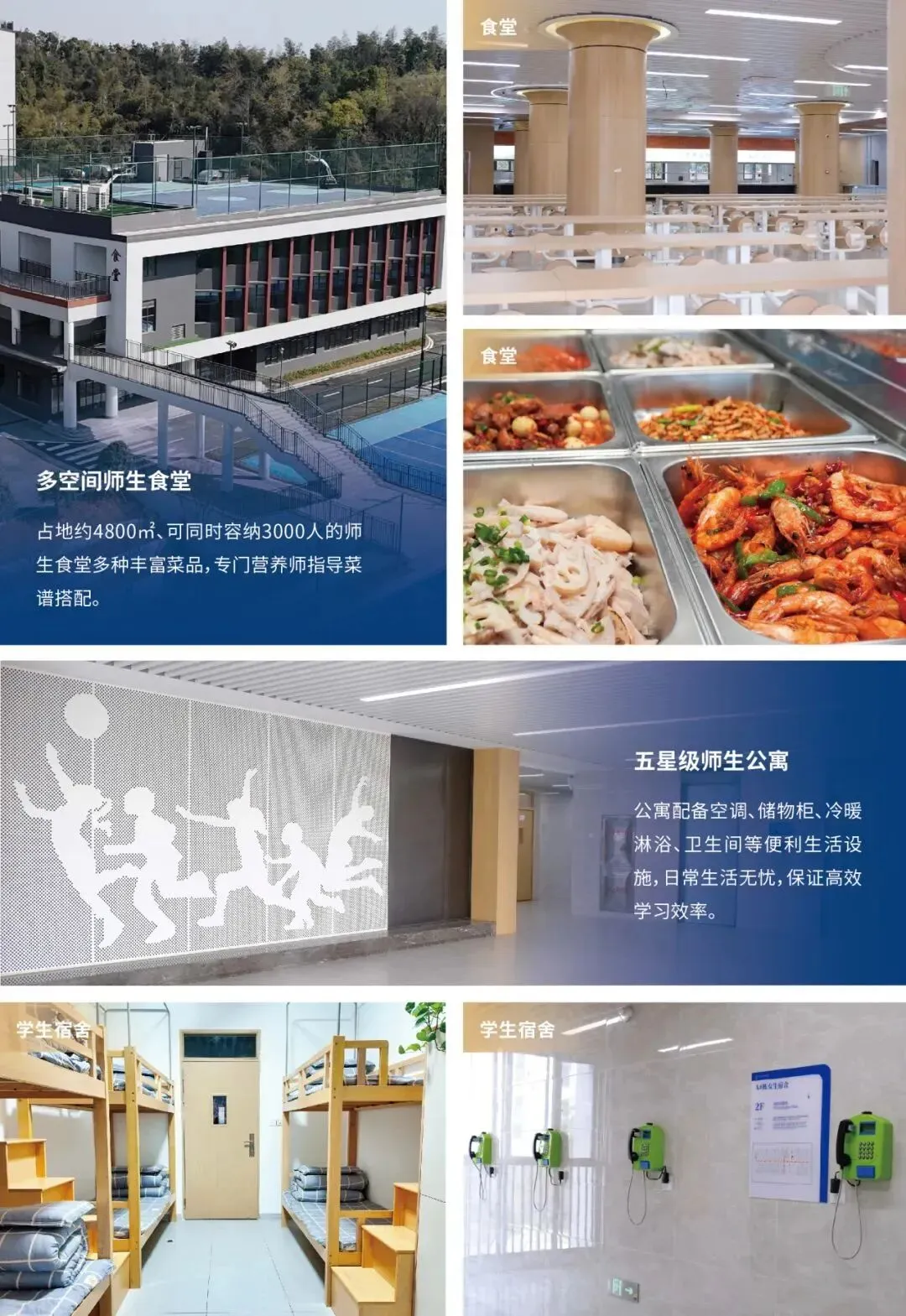占地约4800㎡、可同时容纳3000人的师生食堂,多种丰富菜品,专门营养师指导菜谱搭配
