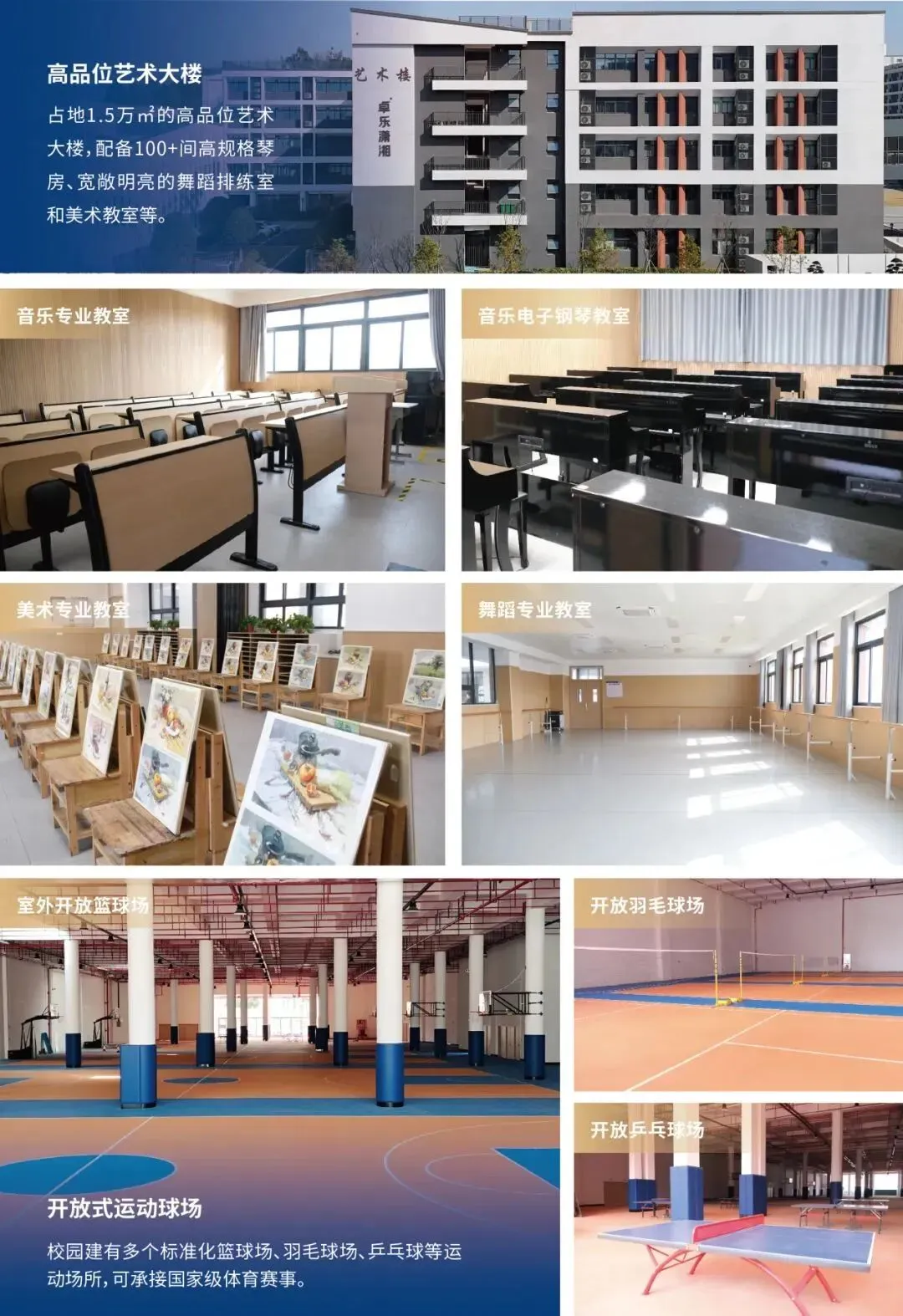 ● 高品位艺术大楼:占地1.5万㎡的高品位艺术大楼,配备100+间高规格琴房、舞蹈教室和美术教室,艺术楼联通容纳1500+人的艺术音乐厅,配置百万级别音响,媲美省级音乐厅的视觉听觉享受。日常模拟校考还有400+人的报告厅和100+人汇报厅的场地支持,顶配的硬件设施。