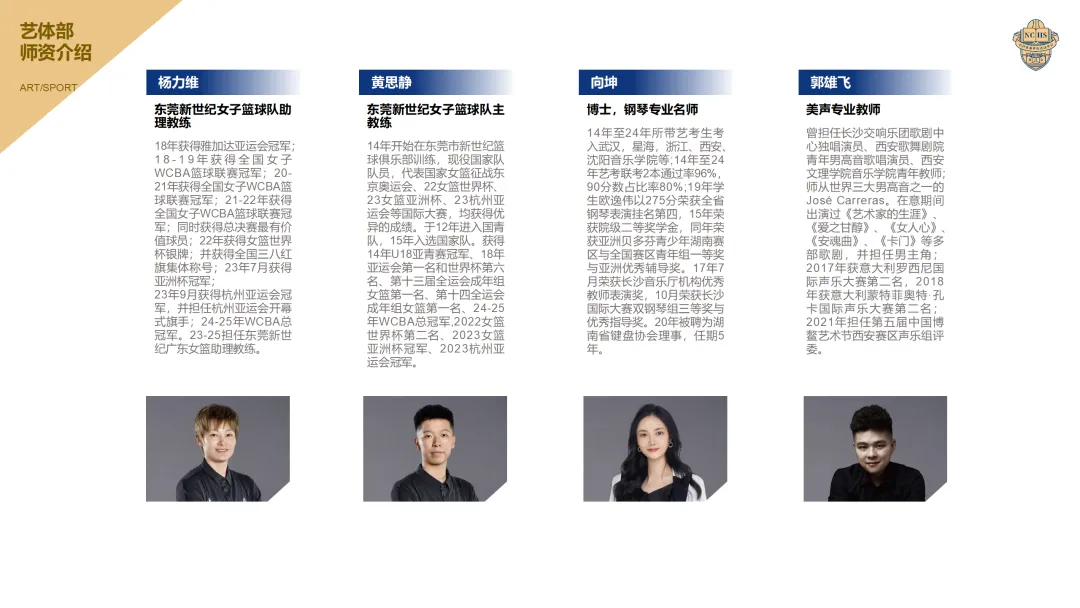 ● 职业化教练团队:由CBA、WCBA明星球员、国家级教练组成专家教练组,学校体育老师均为新世纪篮球青训体系出生运动员、湖南体考状元组成。