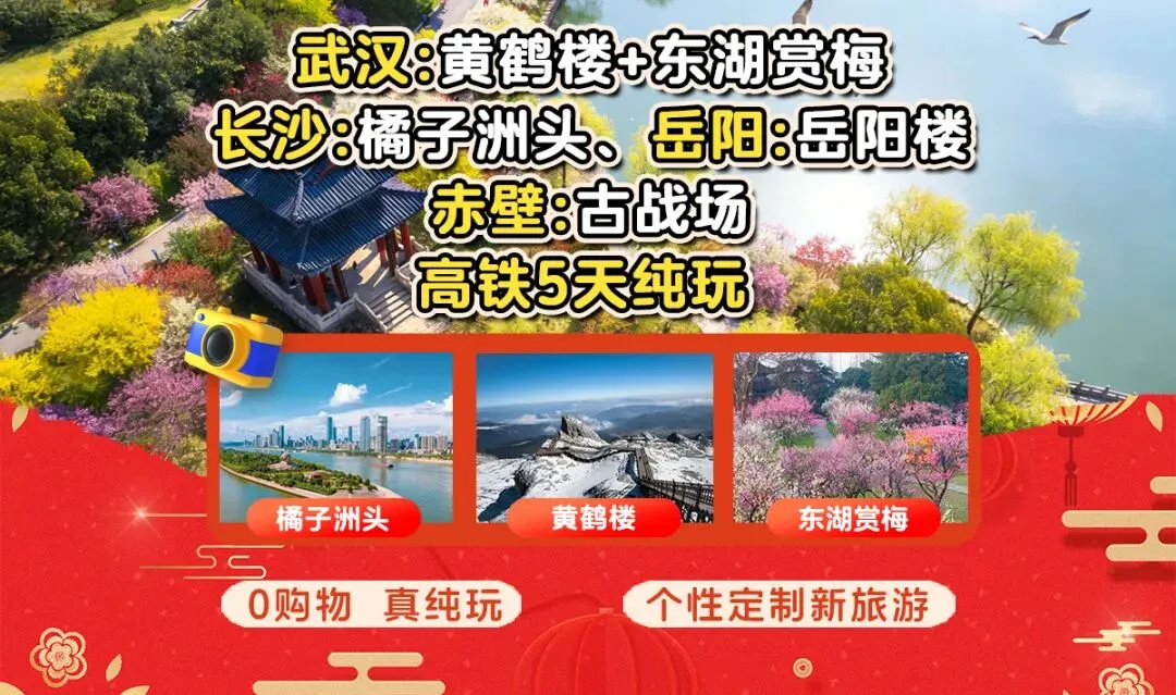 1、跨省联动:串联长沙、岳阳、赤壁、武汉四城,解锁湘鄂核心风光。2、省心出行:珠海高铁往返+城市专车接驳,一站式直达,免去中转麻烦。3、品质住宿:全程网评高口碑舒适酒店,核心商圈/交通便捷,住得舒心。4、核心地标全覆盖:橘子洲、岳阳楼、赤壁古战场、黄鹤楼、省博四大镇馆之宝、东湖赏梅,文化与自然双体验。5、美食狂欢:打卡长沙茶颜悦色/文和友、武汉户部巷/江汉路、岳阳汴河街,解锁网红与地道风味。6、春节限定:东湖早梅+黄鹤楼年味打卡,邂逅冬日限定浪漫;文化打卡、美食寻味、跨省漫游,全家出游优选。