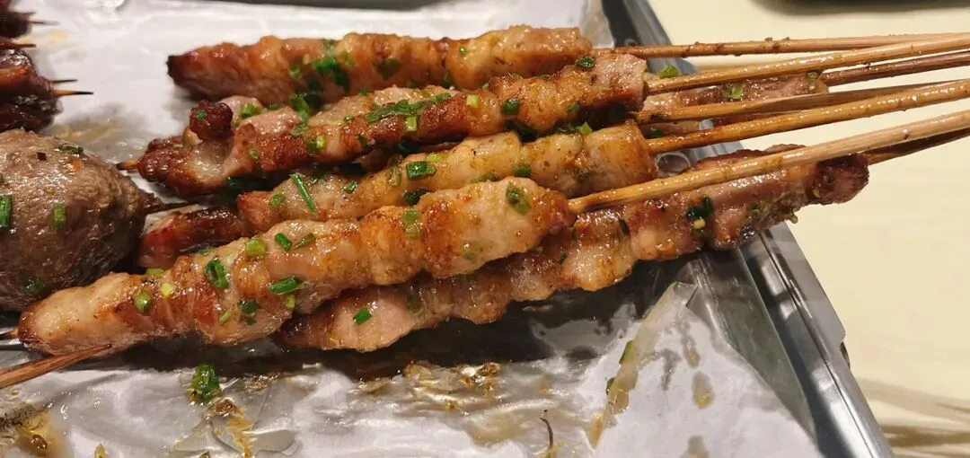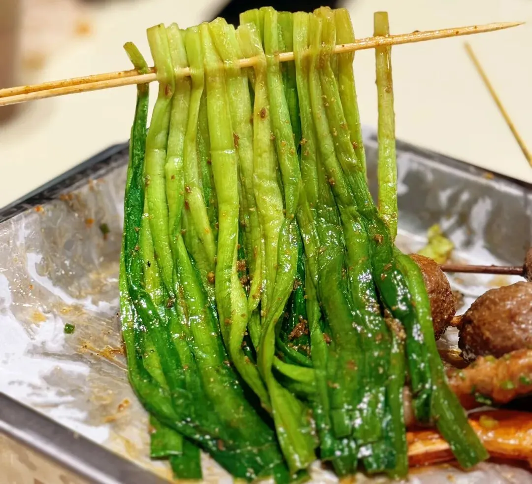 “贯穿始终”的仪式感:就连穿串都透着认真。比如基围虾,竹签必定从头至尾贯穿,这不仅是为了烤制时受热均匀、熟得透彻,也让吃虾这件事变得优雅利落了不少(看惯了某些烧烤店基围虾头独立于竹签之外的草率,不由得对串小白的严谨肃然起敬)。这背后,是管理上不愿将就的体贴。