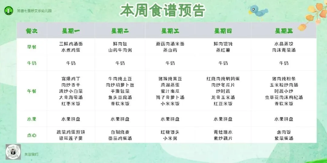 3. 建议家长结合在园食谱,在家每周给幼儿吃一次鱼、每天饮牛奶350ML--500ML, 以保证幼儿钙的摄入量。