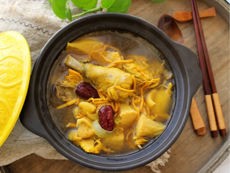 2.准备一口砂锅,将整只鸡放进去,加入菌菇、红枣、枸杞等配料大火煮开。
