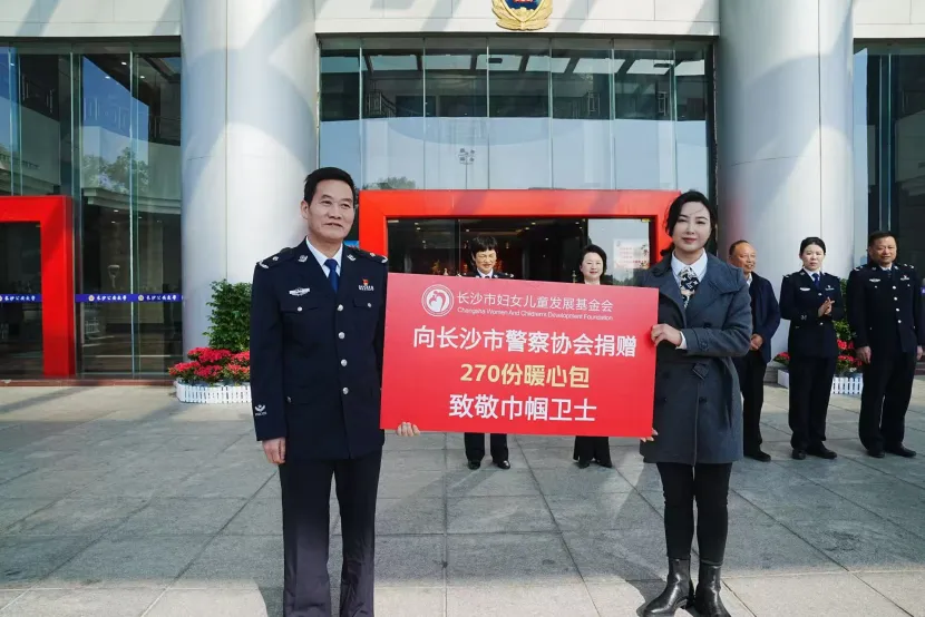 长沙市警察协会会议室内暖意融融,在市妇联党组书记、主席彭娟与市警察协会常务副会长欧益科的共同见证下,长沙市妇基会理事长曾珠将刻有"致敬巾帼卫士"的捐赠牌郑重递交。这块承载着270份定制慰问礼包,不仅凝聚着社会各界的爱心,更镌刻着对女警群体"柔肩担重任"的礼赞。