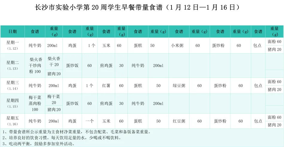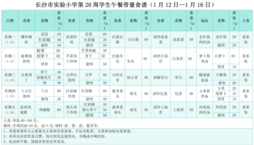第20周学生带量食谱