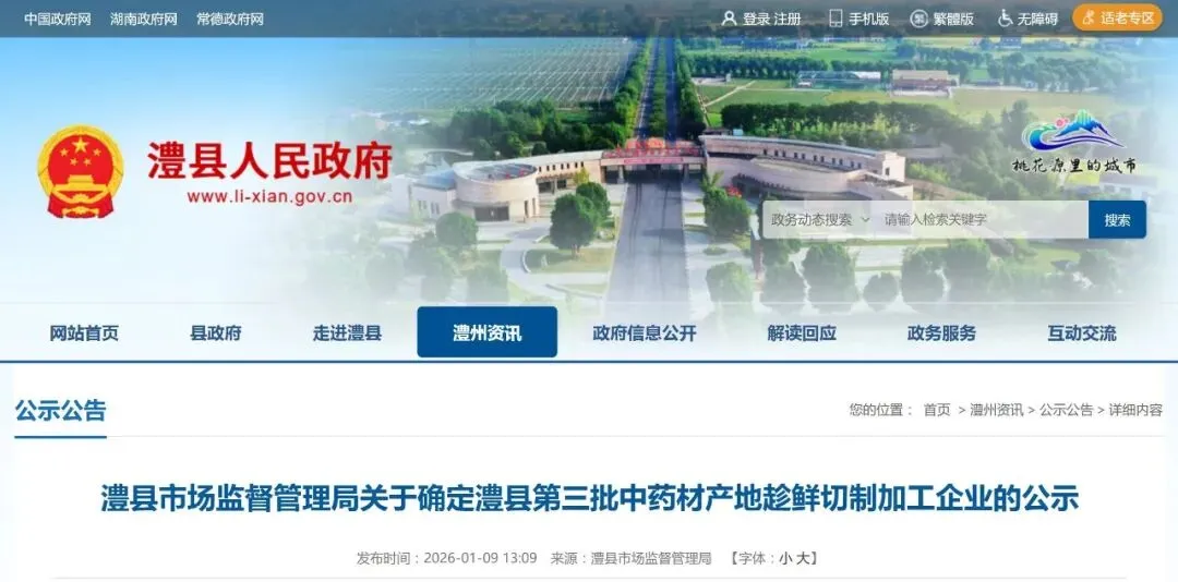 【趁鲜切制】湖南常德 | 关于确定澧县第三批中药材产地趁鲜切制加工企业的公示(260109)