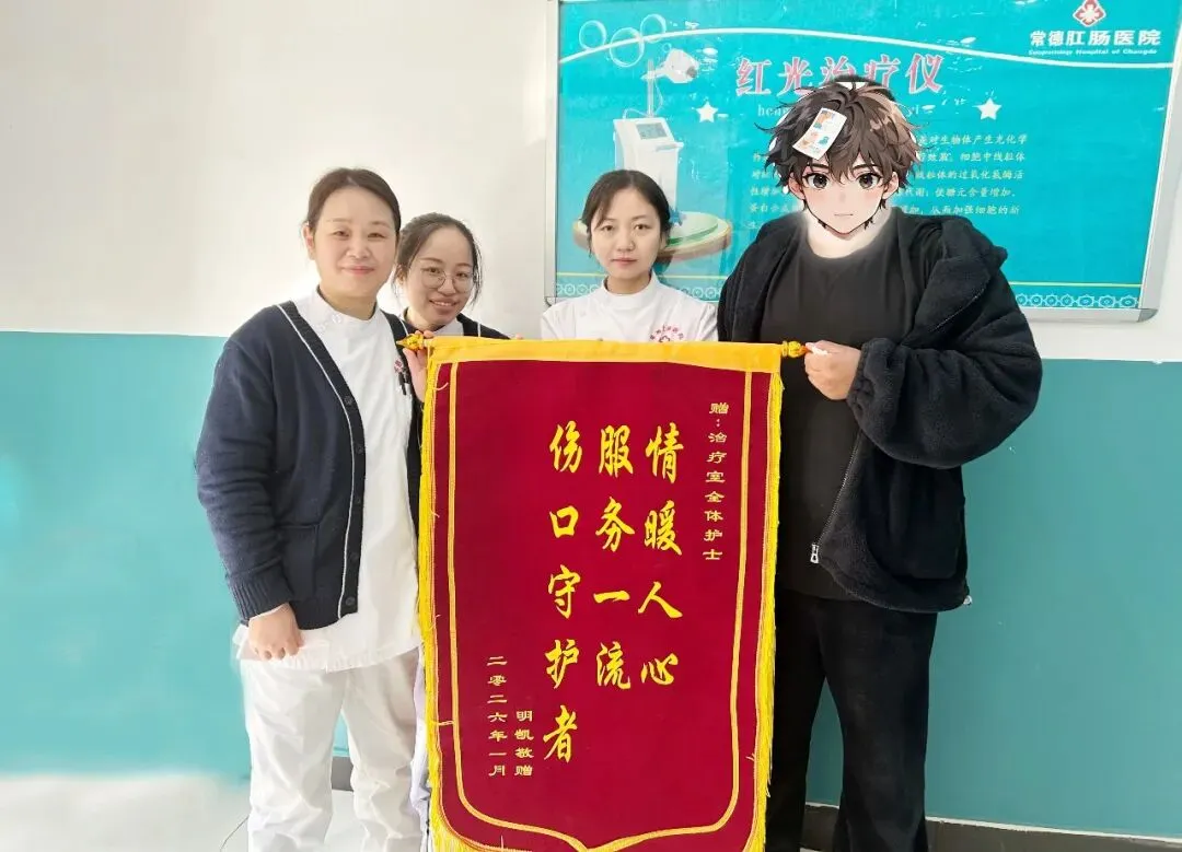 2026年1月9日,常德友好肛肠医院治疗室里,一面鲜红的锦旗让冬日的氛围多了几分暖意。患者明先生专程带着印着“情暖人心、服务一流、伤口守护者”的锦旗而来,郑重地交到治疗室三位护士手中,尤其对着组长杨红云说:“多亏了你换药时陪我唠嗑,不然我这心里得一直揪着。”