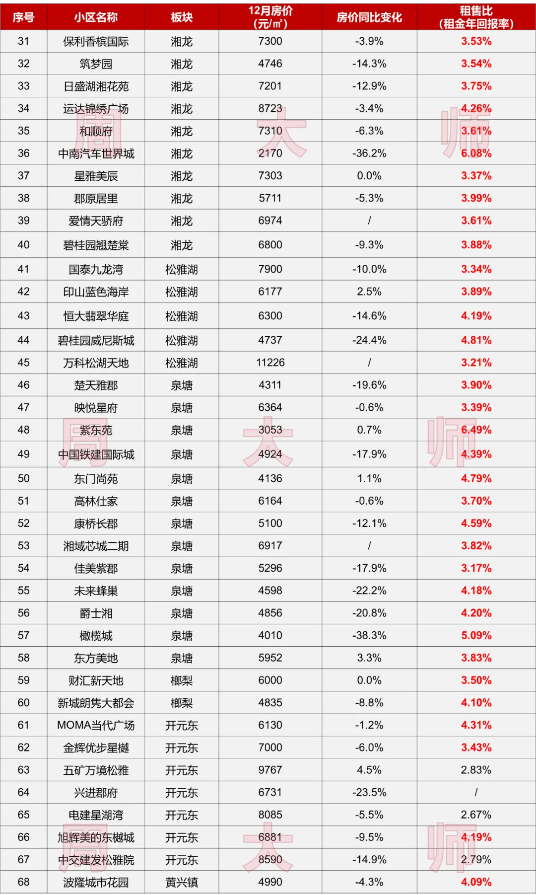 长沙(长沙县)12月68盘二手房价及租售比统计