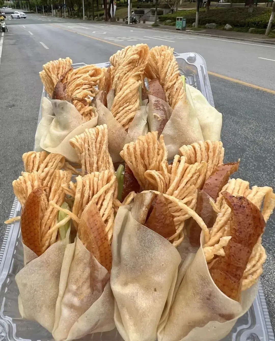 我第一次看到的时候也是一脸问号 , 这俩怎么能凑一块?结果一口下去 , 直接上头了。 外面撒子是脆的 , 里面烤鸭卷是软糯带着油香的 , 两种口感撞在一起 , 真的会让人停不下来。