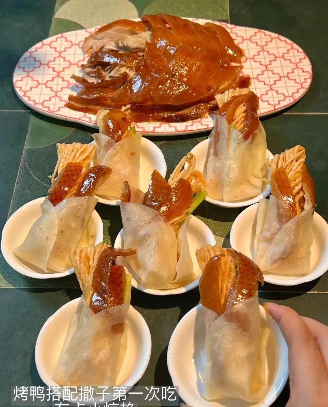 你们见过这种吃法吗?烤鸭卷 , 配撒子。