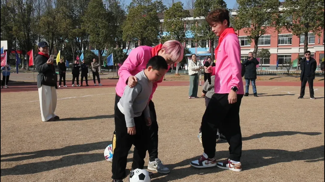 仪式结束后,三名队员来到三星咀中学与围庵小学,开展首次校园足球指导与交流活动。活动中,三位球员为学生带来专业的足球知识讲解、基础技术示范,进行趣味训练与互动比赛。他们通过亲身指导,激发学生们对足球运动的兴趣,传递团结协作、勇于拼搏的体育精神。