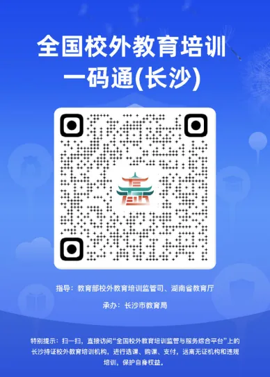 长沙市教育局提醒家长,凡是在周末、寒暑假、节假日开展义务教育学科培训的机构(个人)均为违规培训;凡是无办学许可证开展校外培训的机构均为违规培训机构。校外培训机构一次性不得收取超过三个月或60个课时的费用,非学科类培训机构一次性收费不得超过5000元。另外,家长一定要认准正规的缴费渠道——全国校外培训监管与服务平台的家长端APP,也可扫描“长沙一码通”二维码。