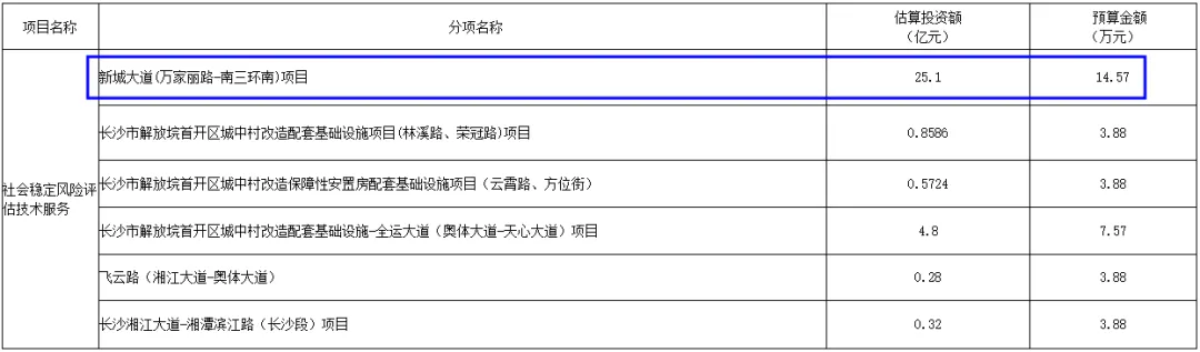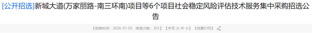 近日,发布了“新城大道(万家丽路-南三环南)项目等6个项目社会稳定风险评估技术服务集中采购招选公告”