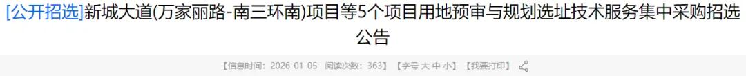 同时,1月5日发布了“新城大道(万家丽路-南三环南)项目等5个项目用地预审与规划选址技术服务集中采购招选公告”
