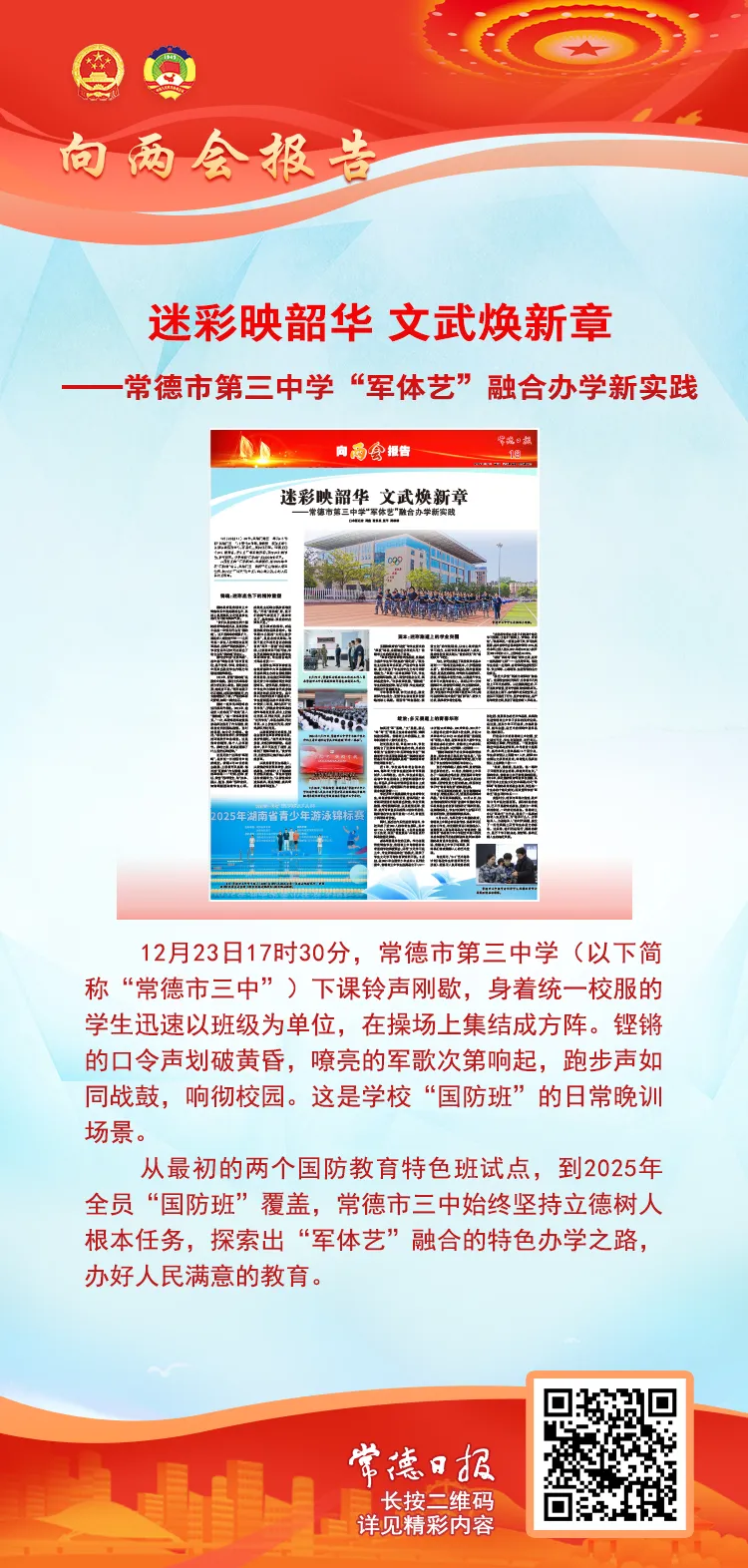 从最初的两个国防教育特色班试点,到2025年全员“国防班”覆盖,常德市三中始终坚持立德树人根本任务,探索出“军体艺”融合的特色办学之路,办好人民满意的教育。