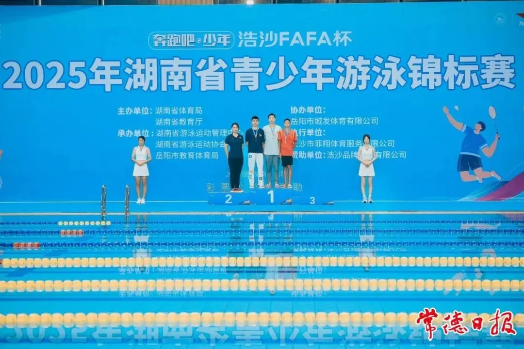 8月,常德市三中学子彭元(左四)在2025年湖南省青少年游泳锦标赛中一举斩获200米混合泳金牌、100米自由泳银牌与100米蝶泳银牌