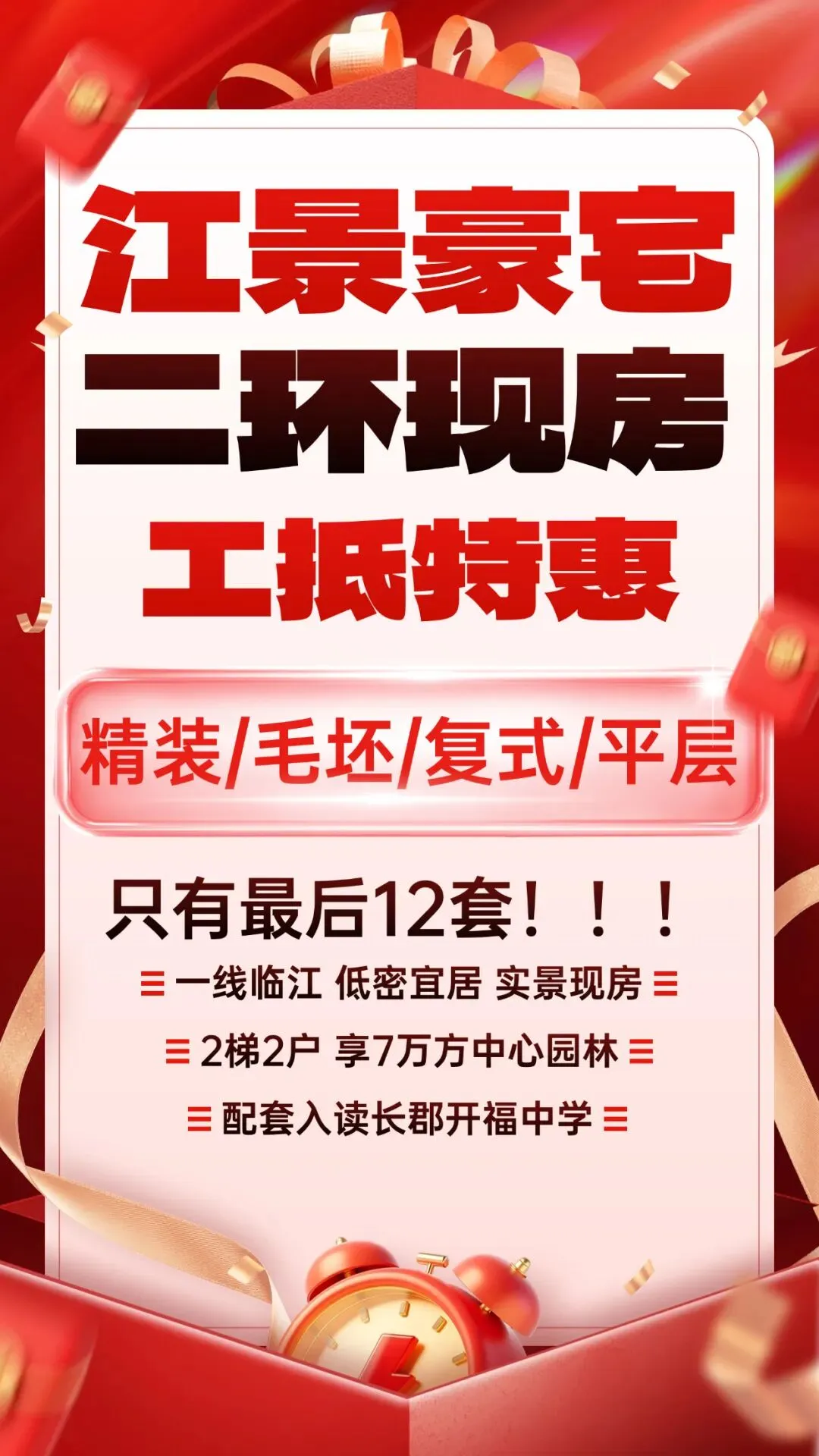 主城二环江景现房豪宅,现工抵特惠来袭!有精装、毛坯、平层、复式多种选择,一线临江的高品质豪宅,配套长郡学校,仅12套稀缺房源,面积涵盖120-256-276-290-352-483㎡,速抢!
