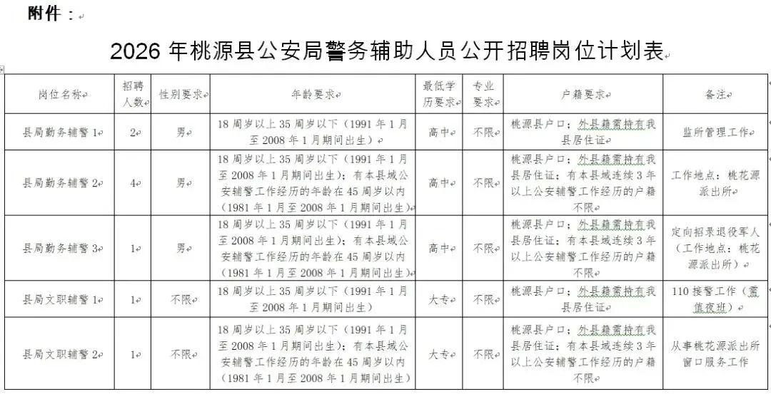 具体招聘岗位、人数、资格条件等详见《2026年桃源县公安局警务辅助人员公开招聘岗位表》。