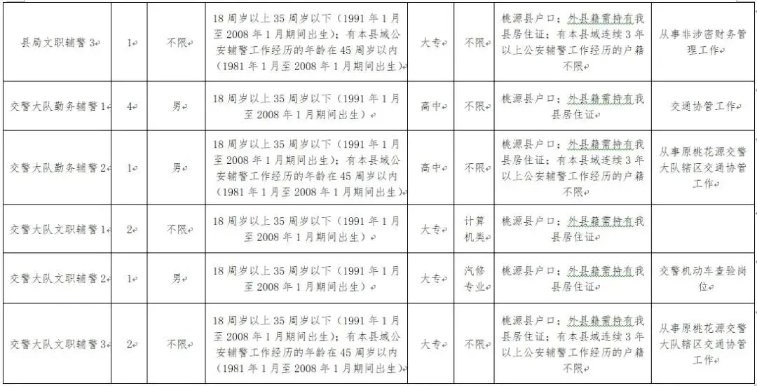 7.年龄在18周岁以上、35周岁以下(1991年1月至2008年1月期间出生);曾经在本县域范围内(含桃花源)有过连续3年以上公安辅警工作经历且非因违纪违法离职的年龄可以延长至45周岁以内(1981年1月至2008年1月期间出生);