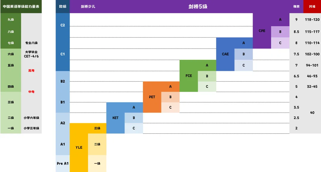 KET/PET的成绩可以完美对标欧标,KET相当于雅思2.5-3.0分,PET相当于3.5-6.0分。这也就意味着考完PET、FCE,能够无缝对接雅思托福,为未来想要出国留学的同学们打下良好基础!