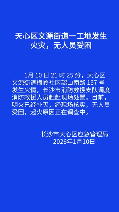 1月10日21时25分,长沙市天心区文源街道一工地发生火灾。天心区应急管理局深夜发布情况通报,具体内容如下: