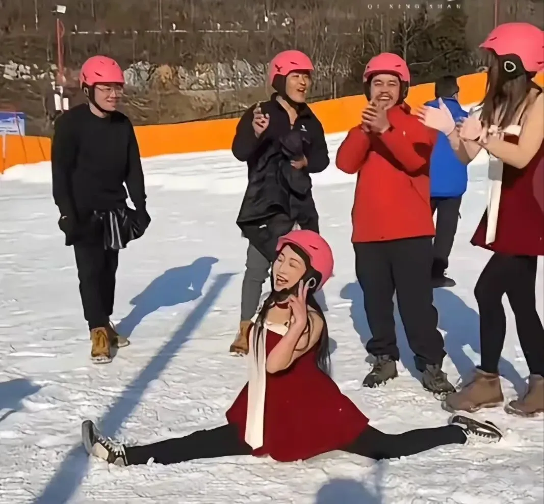 1月8号荒野参加滑雪队员,特意去商场挑比赛服装,两个男成员选了吊带短裙配丝袜的女装,今天赛场一亮相,除了韦山穿得正常,另外几人让人看了眼前一亮,花花和小宋换上吊带抹胸短裙,陆总和另一位安全员的短裙则因为天冷套在了裤子外面,他们还一起跳起了热门的《QQ爱》。
