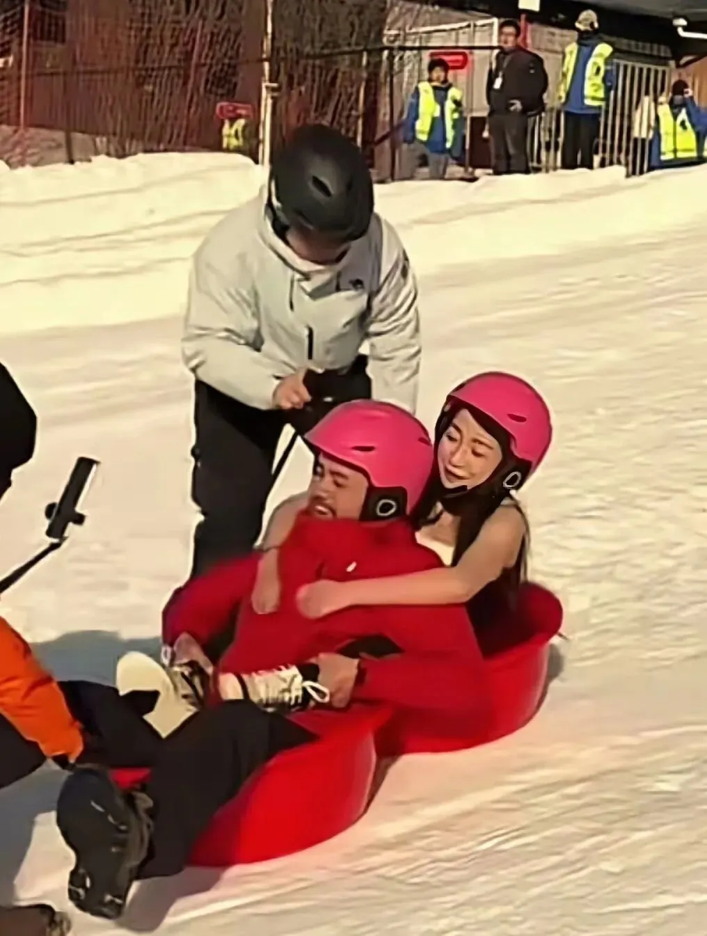 韦山队买的大红盆,韦山坐在大红盆里,后面女选手坐在韦山后面,开赛后女选手吓的抱着韦山,没滑多远也翻车倒在雪地上。