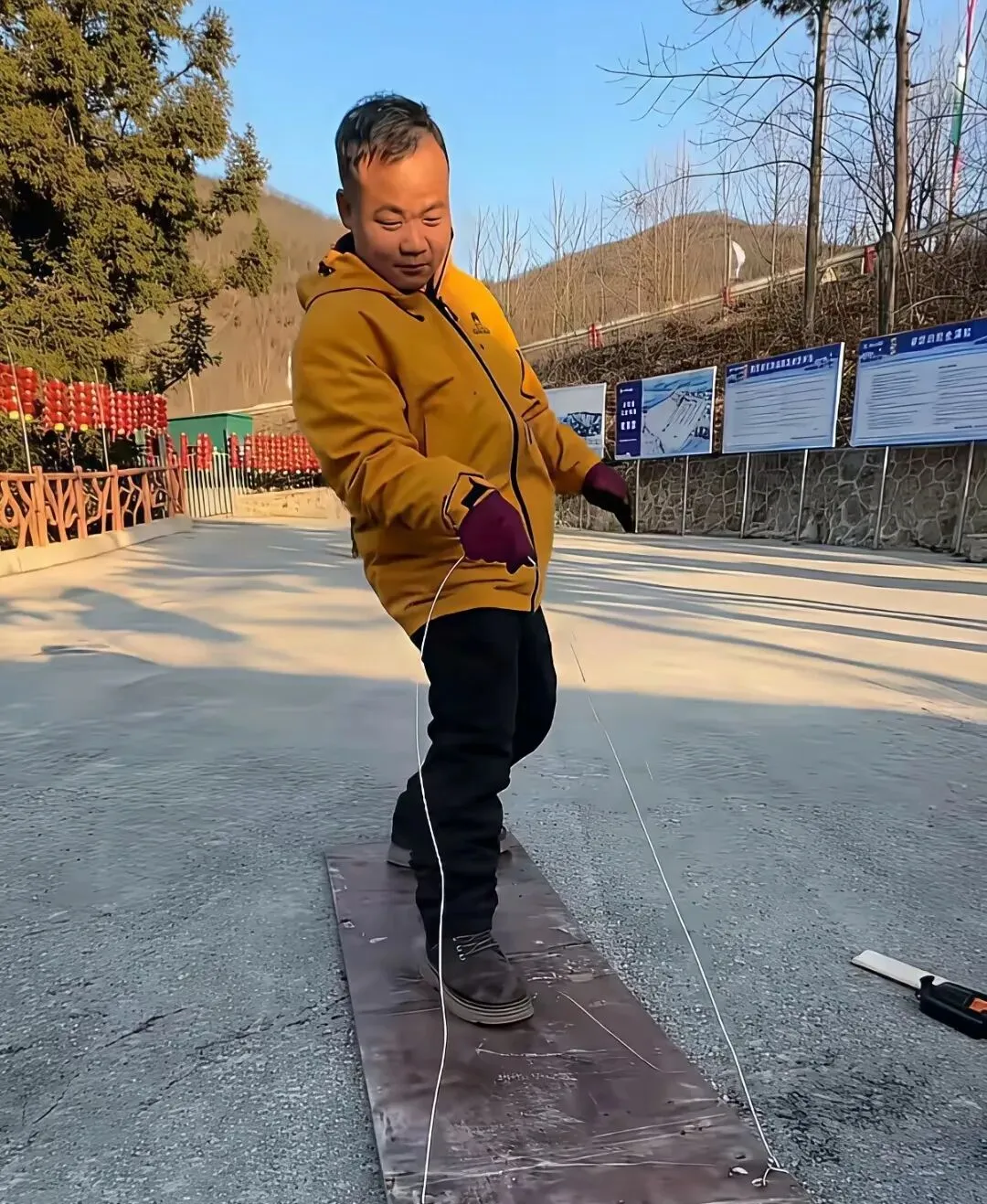 荒野趣味滑雪比赛在热烈的气氛中,一声哨响,比赛开始了,只见苗王拿着切肉案板,案板头两边有两根绳子,女选手拉着两根绳子,苗王站在案板上开始滑,没滑多远拉绳选手和苗王都摔倒在雪地上。