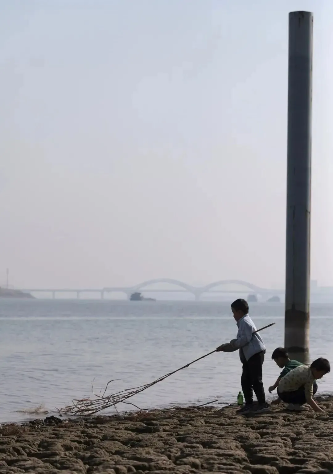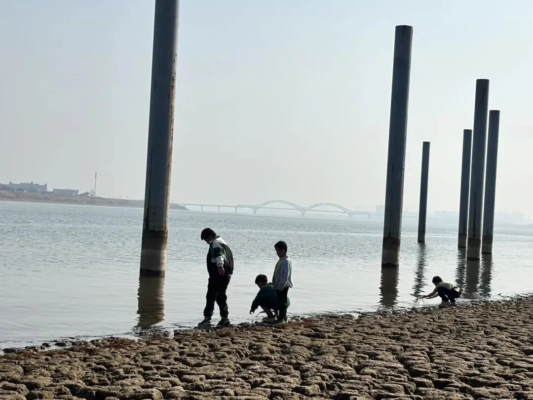 下山后走到马路对面的湘江边,隔江对面是巴溪洲。江边有石头、有水,娃们就可以玩很久,挪不开脚。最近雨水少,江水很清澈,水里很多长了青苔的小螺蛳。