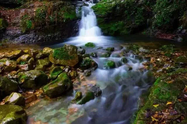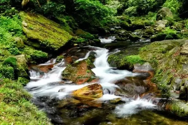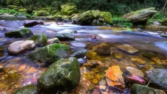 清可见底的小溪,溪里有小鱼漫游,小溪旁树木葱葱,水声叮咚响透山谷。沿着岸边走,满目丽景,犹似画中游。