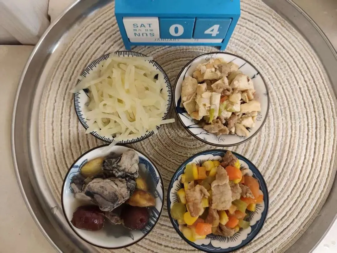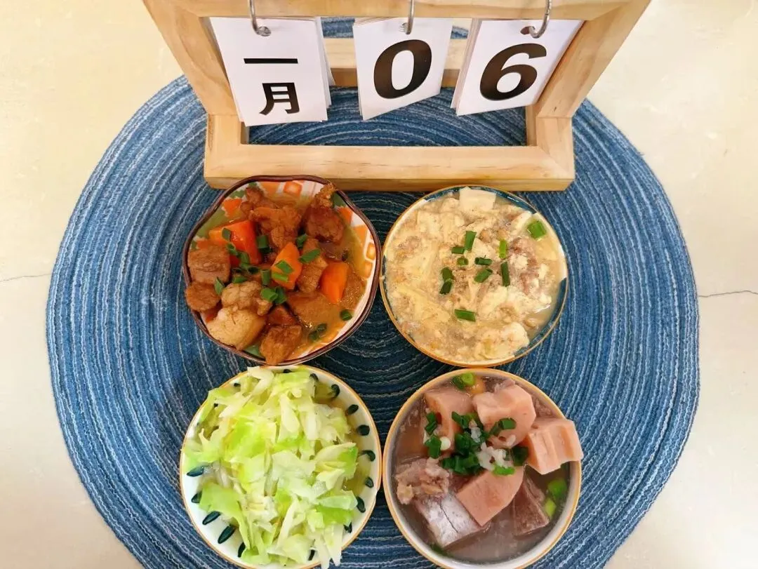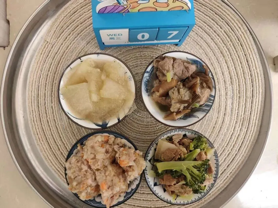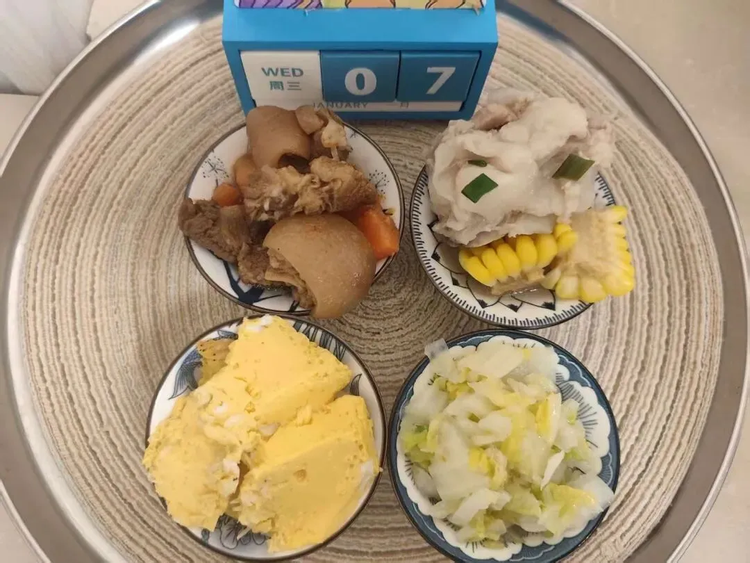 软米饭、胡萝卜烧猪脚、虾皮鸡蛋羹、