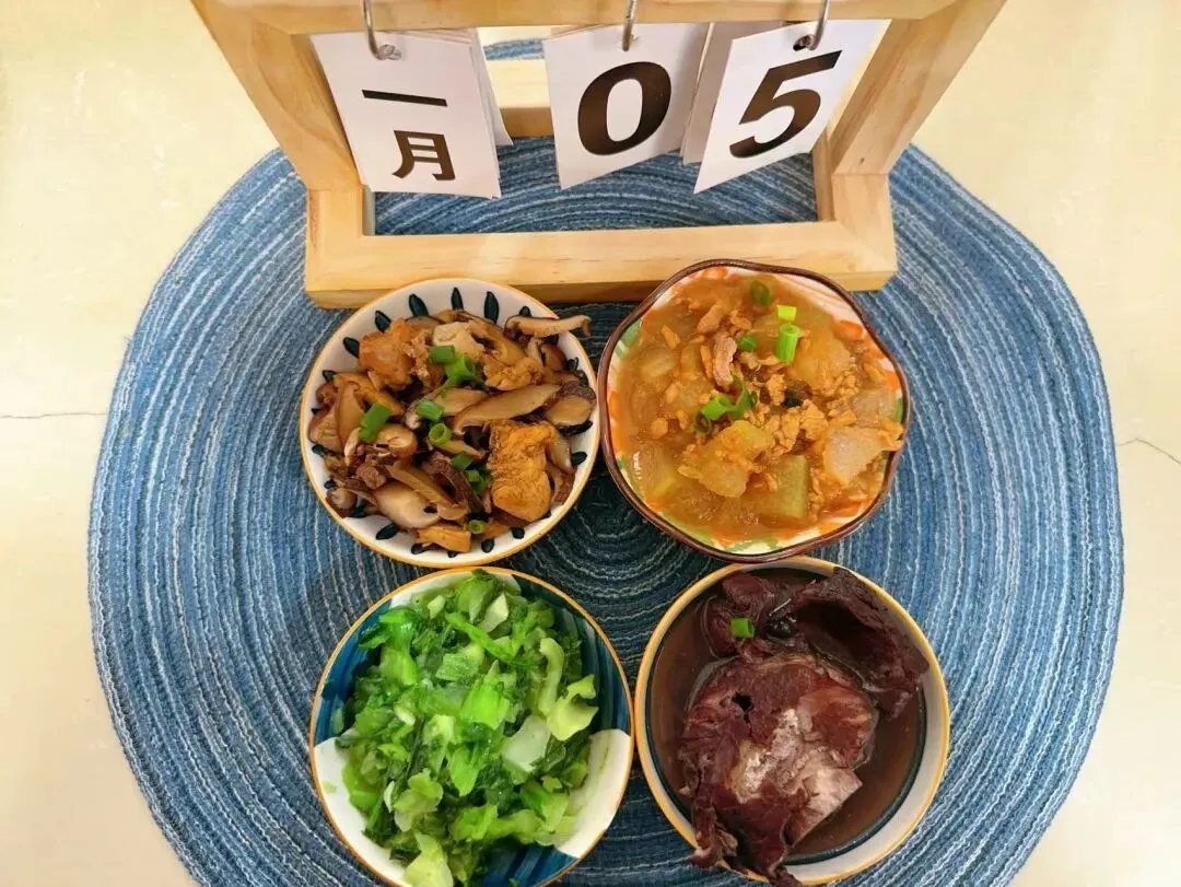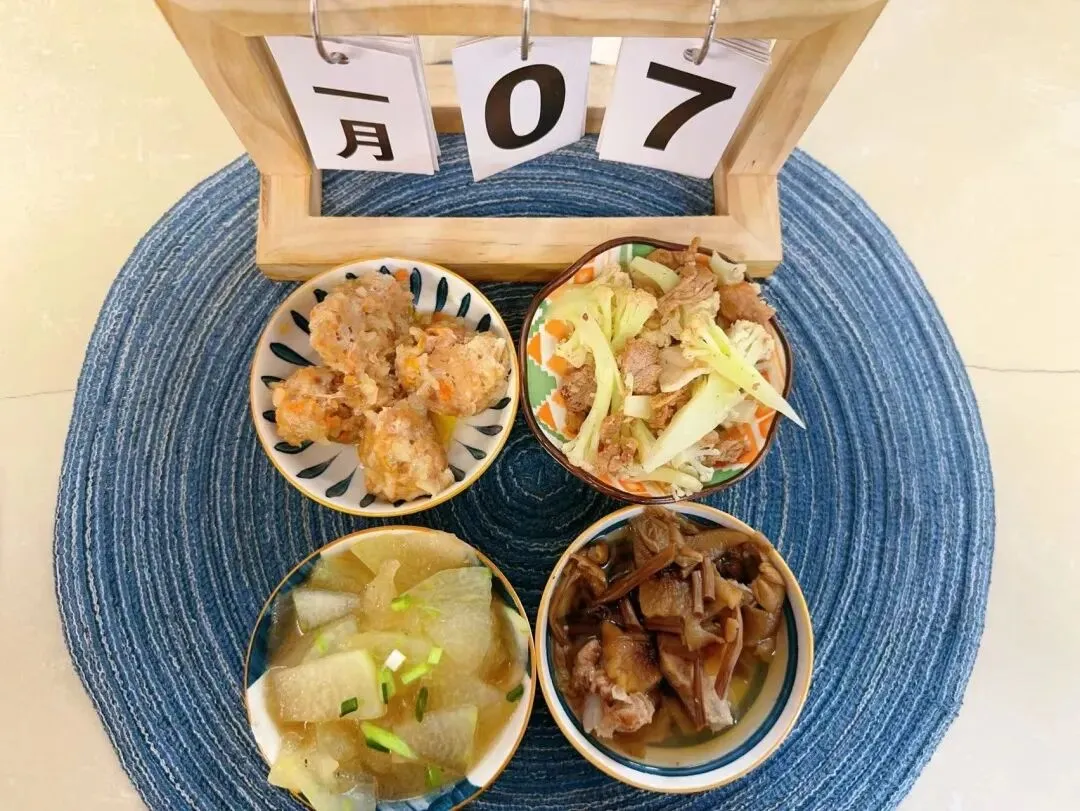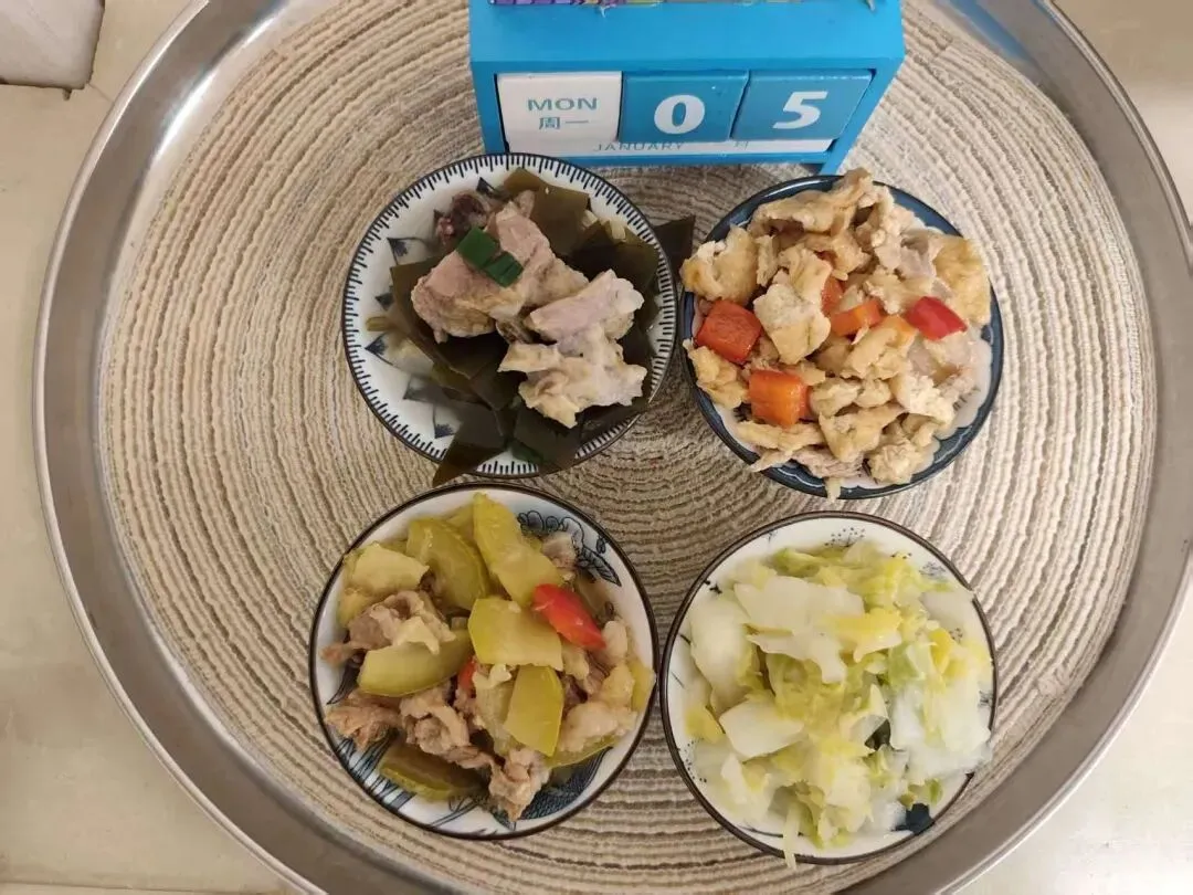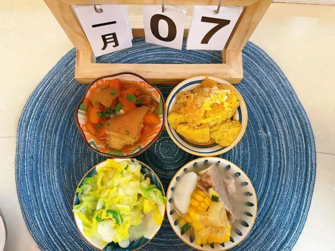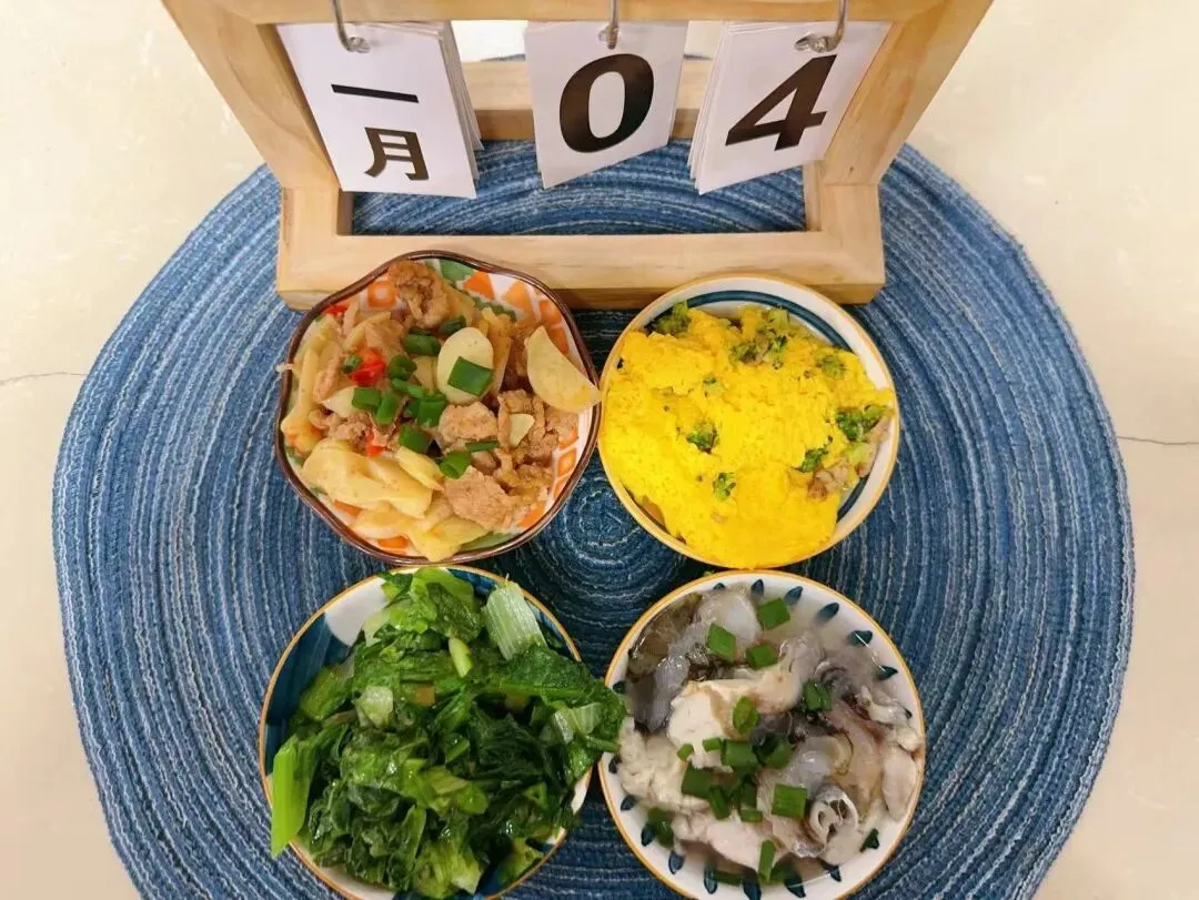 软米饭、胡萝卜烧猪脚、虾皮鸡蛋羹、
