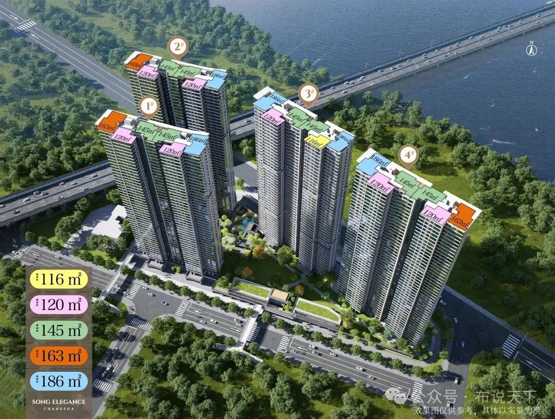 长沙稀缺的限价盘,毛坯限价仅1.12万/㎡,主推120-145-163-186㎡,综合得房率超110%,横向对比周边老规河景盘,性价比优势明显。