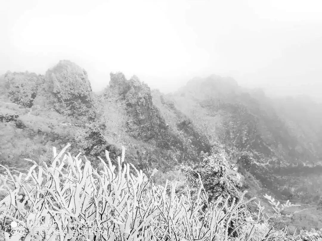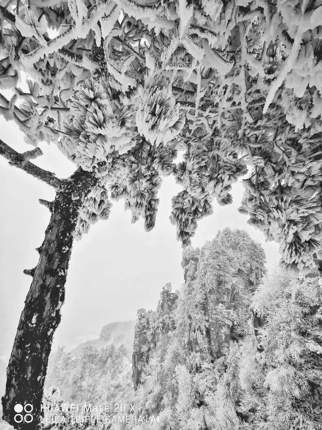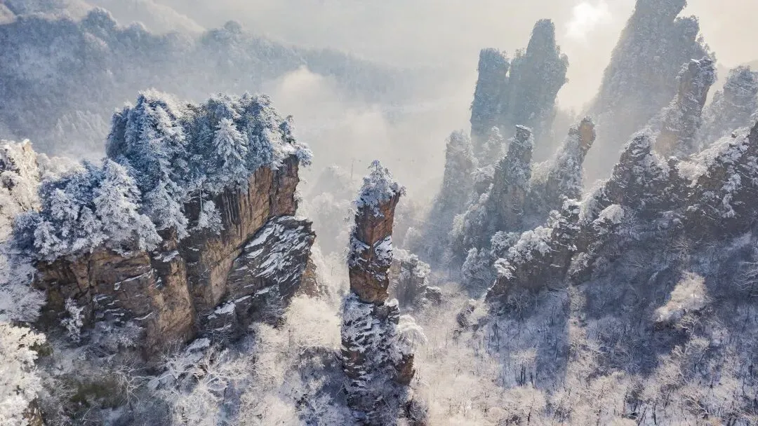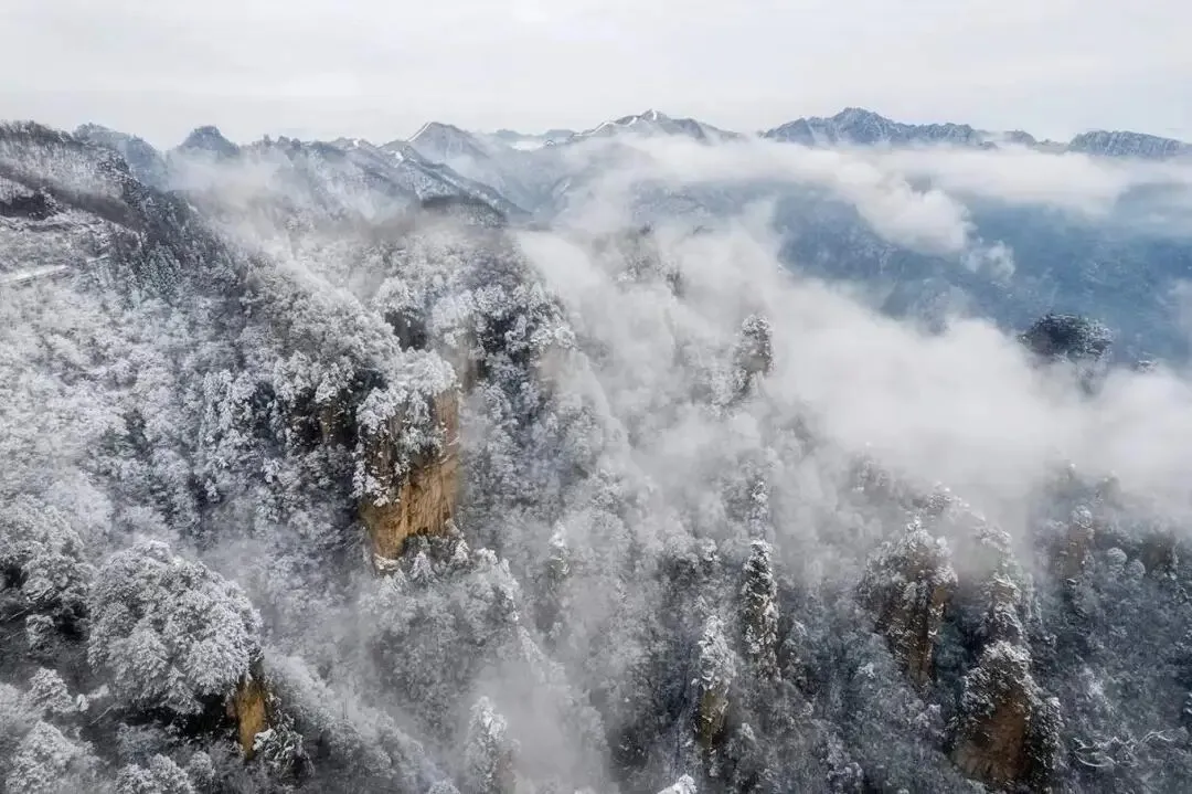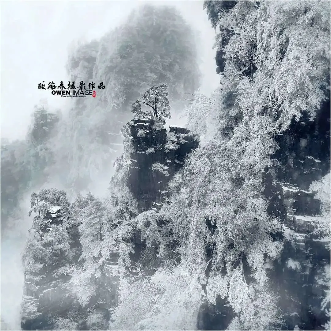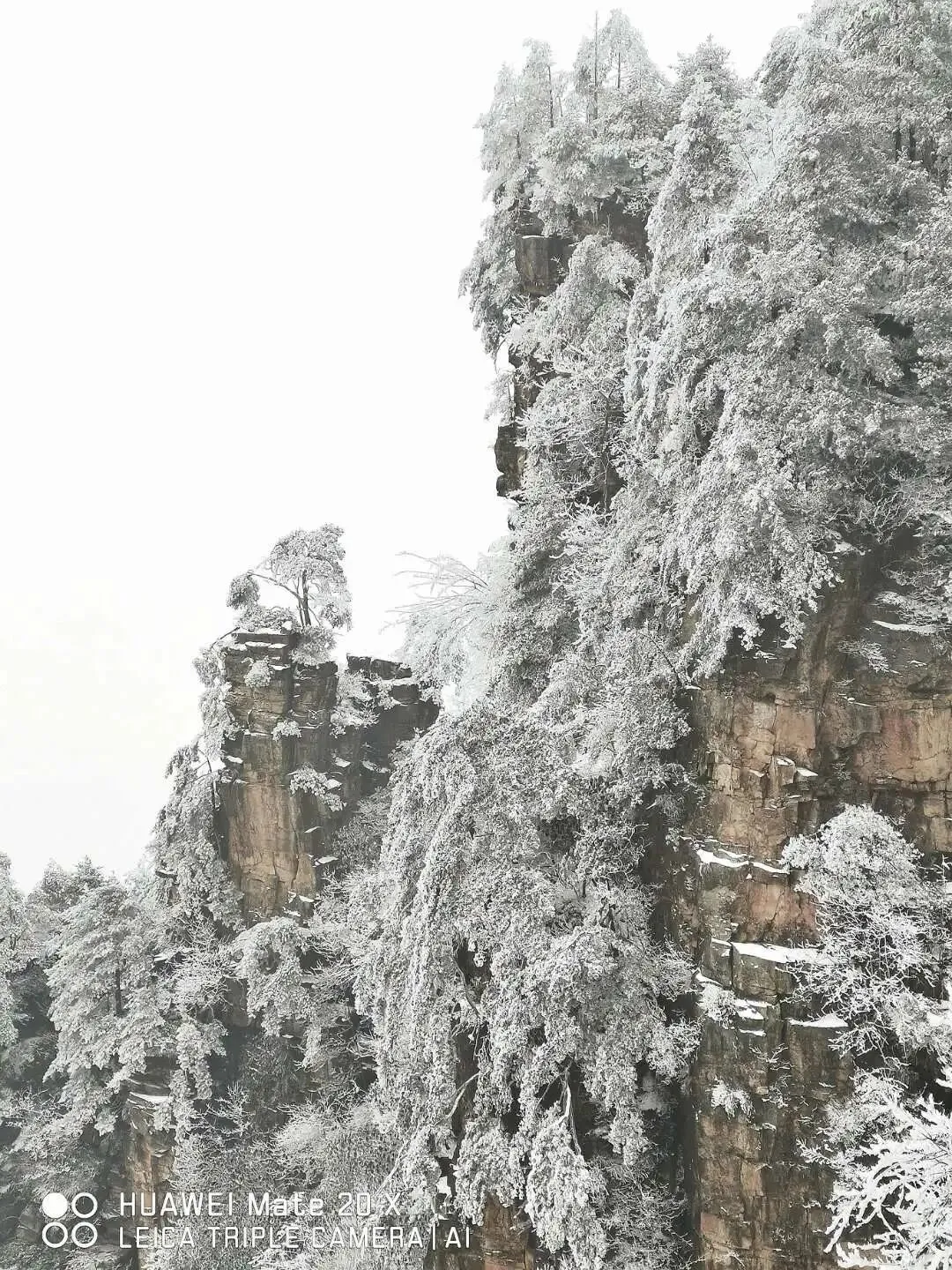 天子山的 “雾凇缀琼枝”:贺龙公园的松柏挂满毛茸茸的雾凇,冰珠折射着微光,御笔峰的 “笔尖” 凝着霜花,宛如文人挥毫后的水墨丹青,长焦抓拍 “雪落枝头” 的瞬间,连冰晶坠落的轨迹都充满诗意。