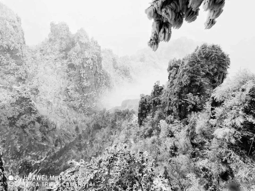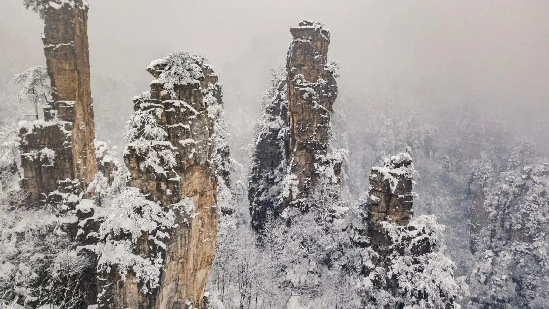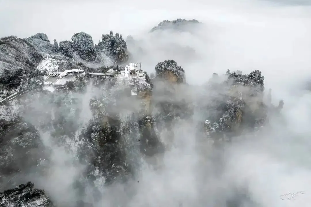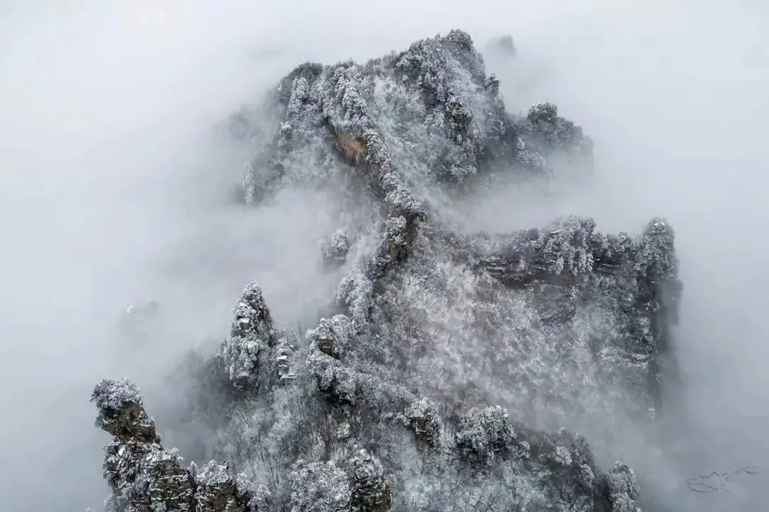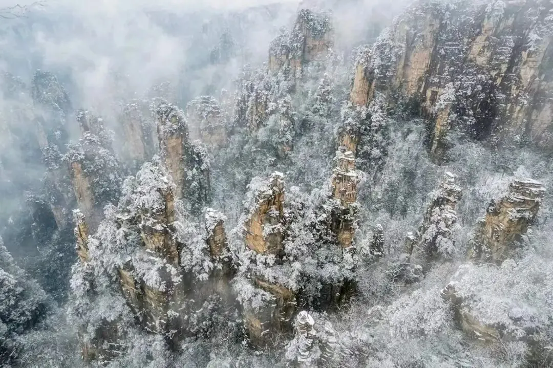 黄石寨的 “银装列队”:千座石英砂岩峰林裹着厚雪,像身披白甲的神兵列阵,航拍镜头下,雾海金龟、天桥遗墩的轮廓在雪中更显苍劲,夕阳斜照时,雪顶泛着暖金,黑白灰的层次里藏着极致张力。