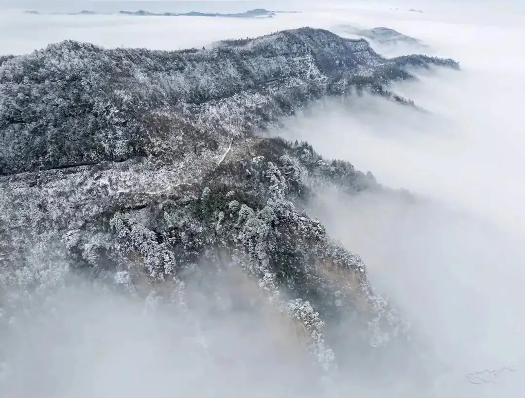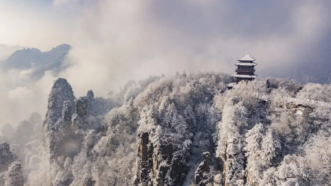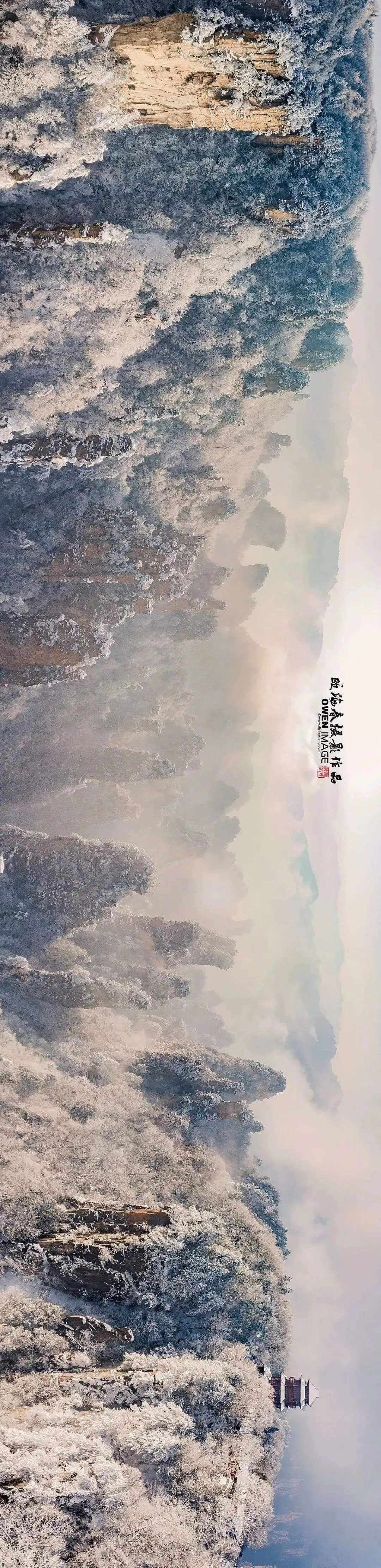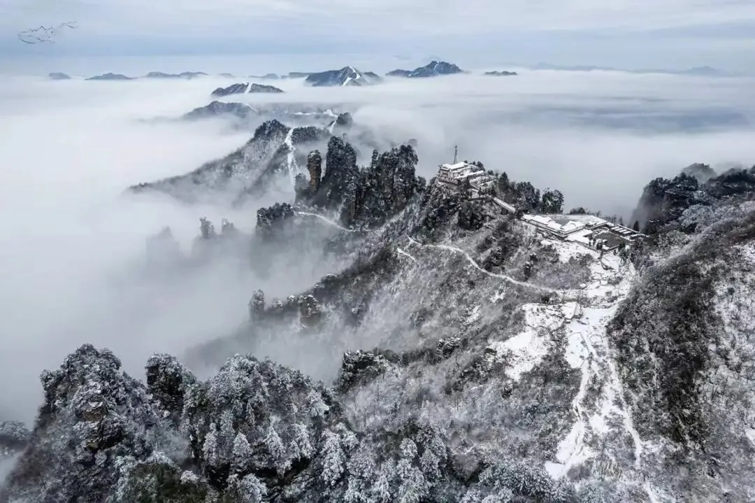黄石寨的 “银装列队”:千座石英砂岩峰林裹着厚雪,像身披白甲的神兵列阵,航拍镜头下,雾海金龟、天桥遗墩的轮廓在雪中更显苍劲,夕阳斜照时,雪顶泛着暖金,黑白灰的层次里藏着极致张力。