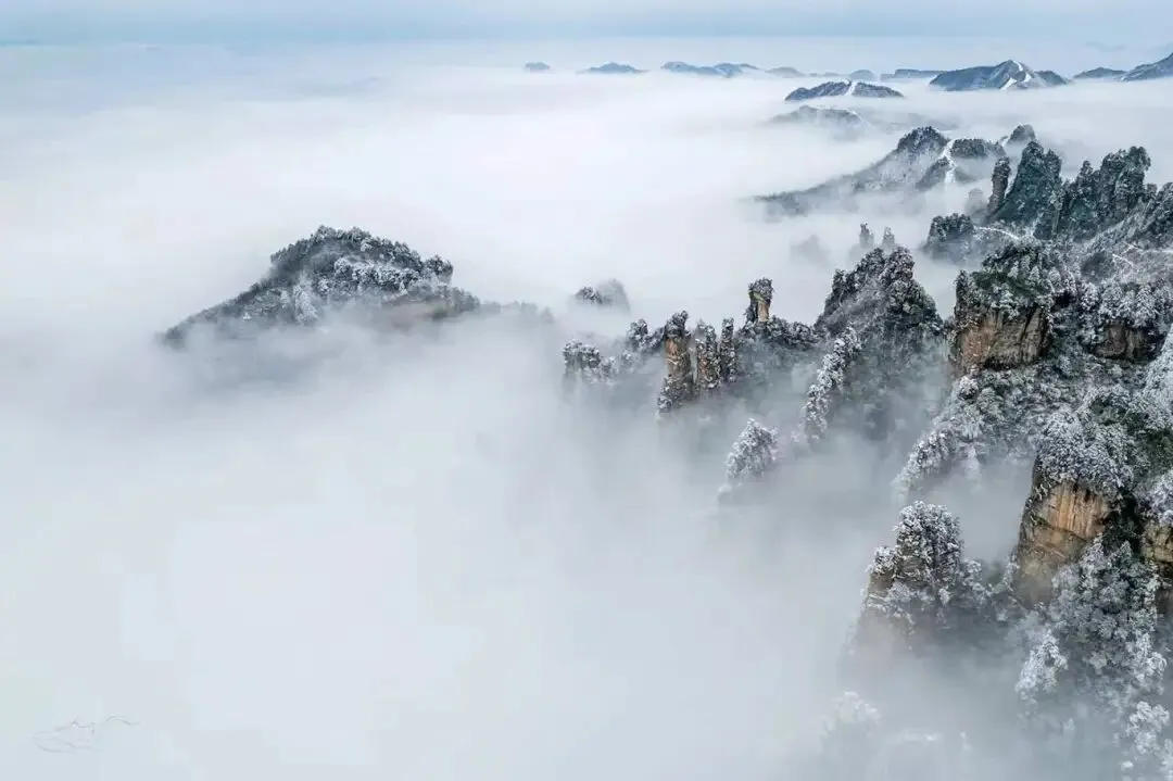 袁家界的 “悬浮仙境”:哈利路亚山原型地的石柱被雪勾勒出棱角,迷魂台的云海漫过绝壁,雪峰在云涛中时隐时现,仿佛悬浮在天地间的梦幻岛屿,慢门拍摄能捕捉到云海流动与雪峰静止的动静对比。