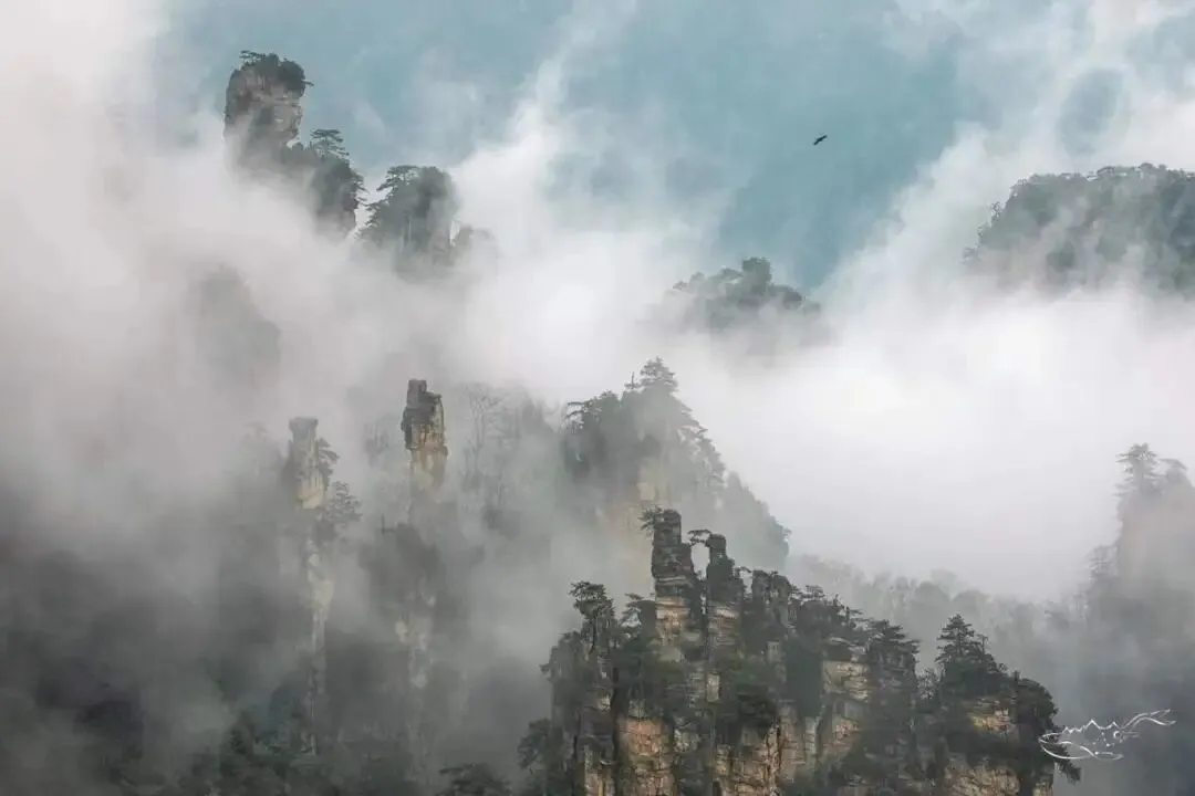 云海的 “流动诗篇”:冬季低温让山谷间的云海更易形成,站在黄石寨摘星台,云涛翻涌着漫过峰林,时而如轻纱缠绕山腰,时而如巨浪拍打绝壁。