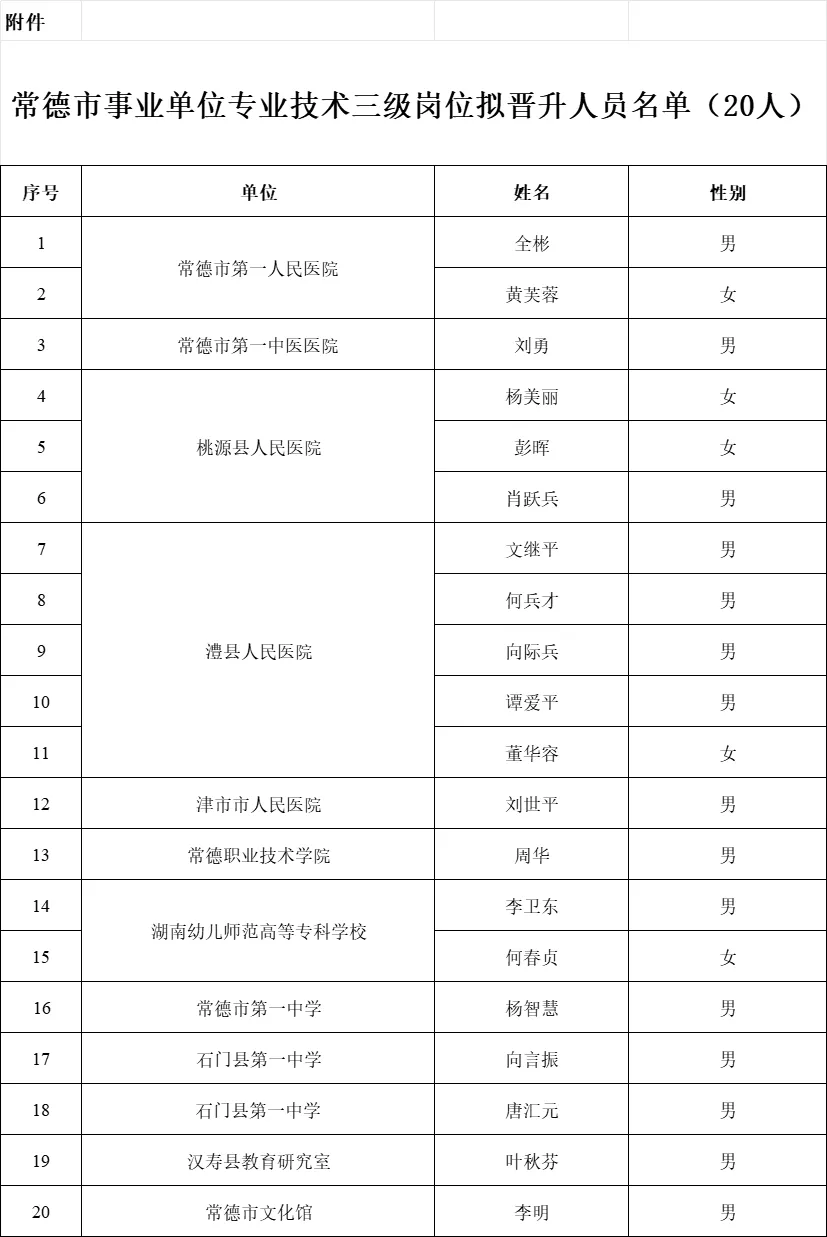 根据《关于做好常德市事业单位专业技术三级岗位人员评聘工作的通知》(常人社函〔2025〕14号)要求,经各县市区和市直事业单位主管部门批准,市人社局对事业单位岗位设置、晋升专业技术三级岗位人员的任职资格进行复核,确定全彬等20名同志为常德市事业单位专业技术三级岗位拟晋升人员(见附件),现予以公示,公示时间为2026年1月12日—1月16日(不少于5个工作日)。公示期间接受社会举报,举报者应以实名反映问题,所举报问题必须真实准确,并提供有关调查核实线索,不受理匿名举报。