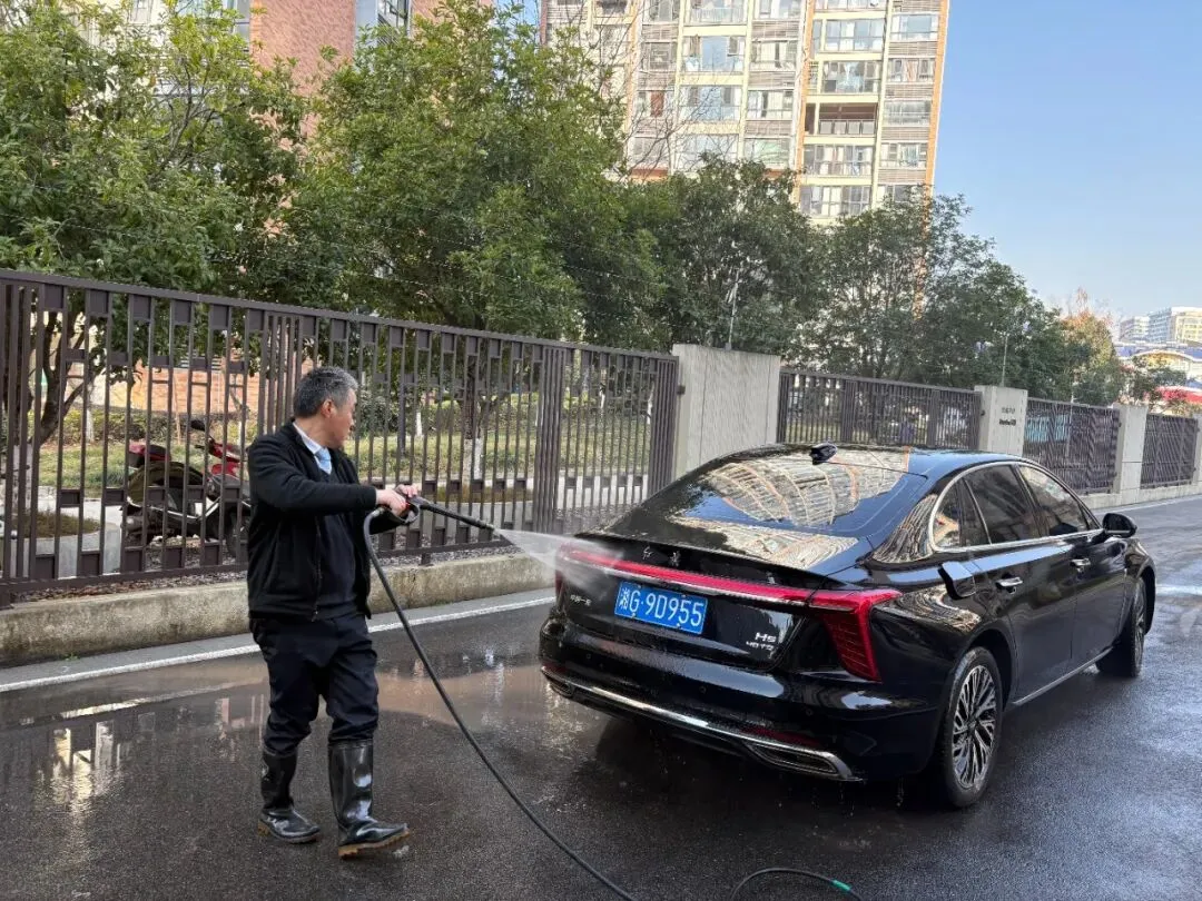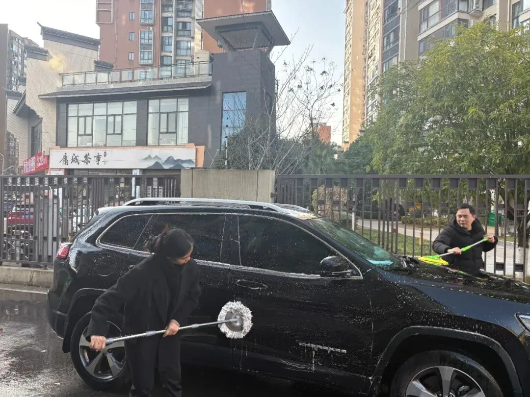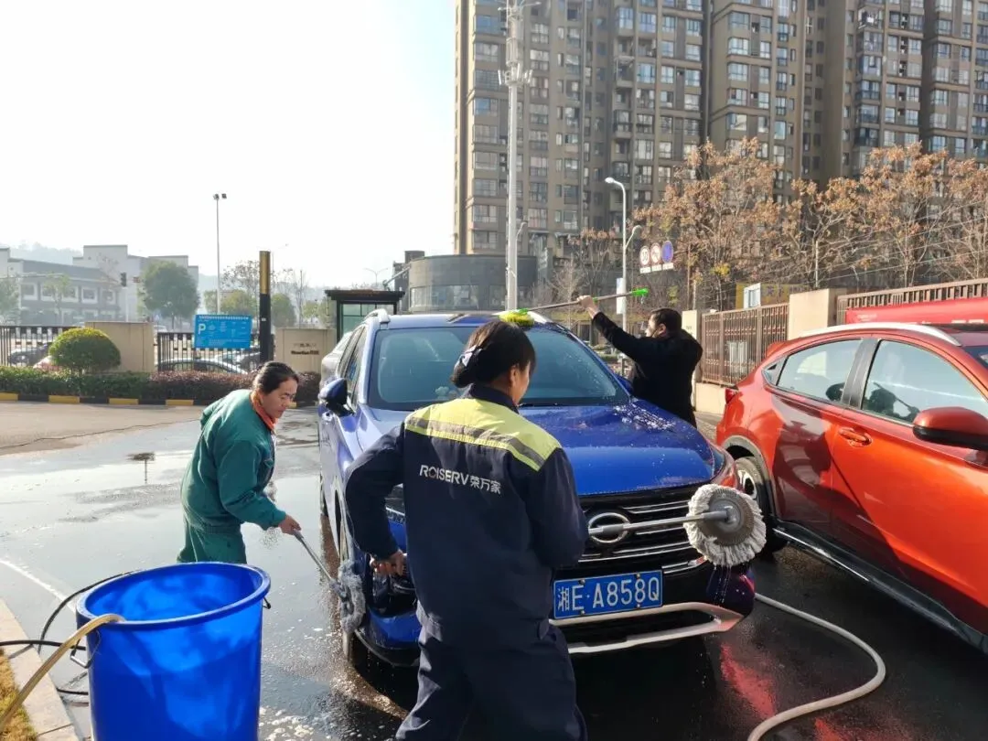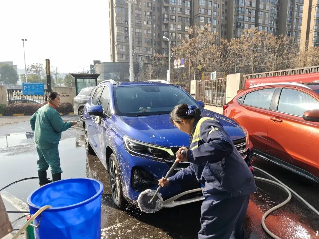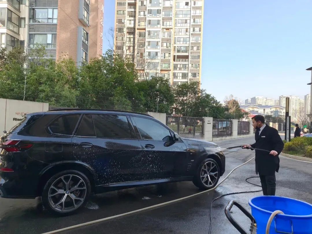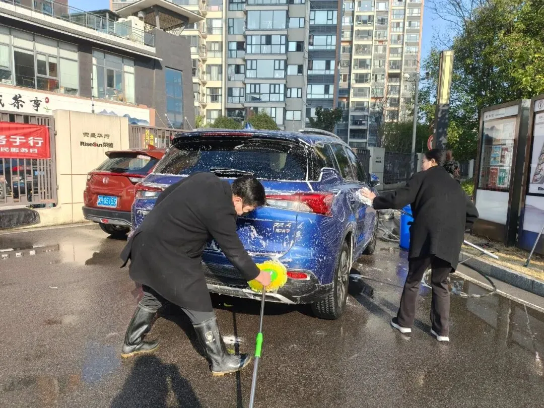 活动当天,洗车区域成为小区里最热闹的“打卡点”——物业工作人员化身“爱车守护者”,分工明确、默契配合:冲水湿车时动作轻柔,避免水花溅洒;打泡沫清洁剂时均匀细致,不留死角;刷洗车身时格外用心,呵护每一处车漆。