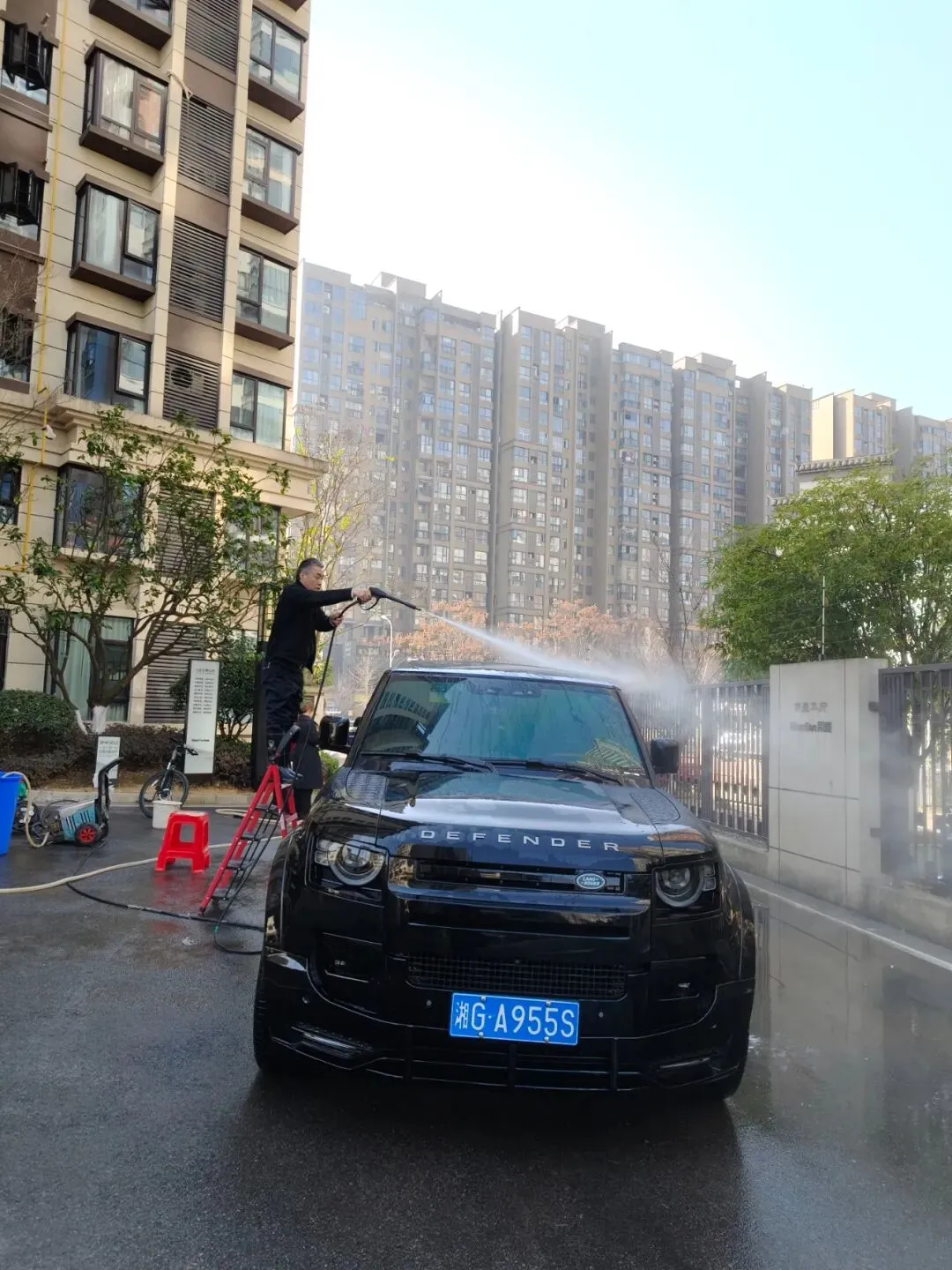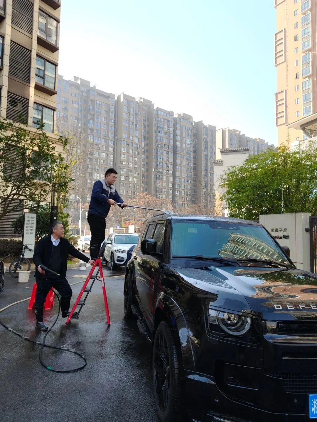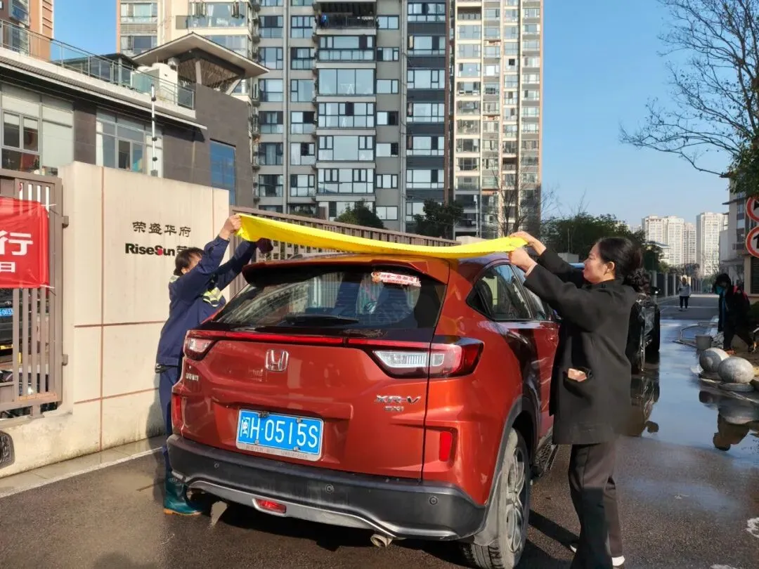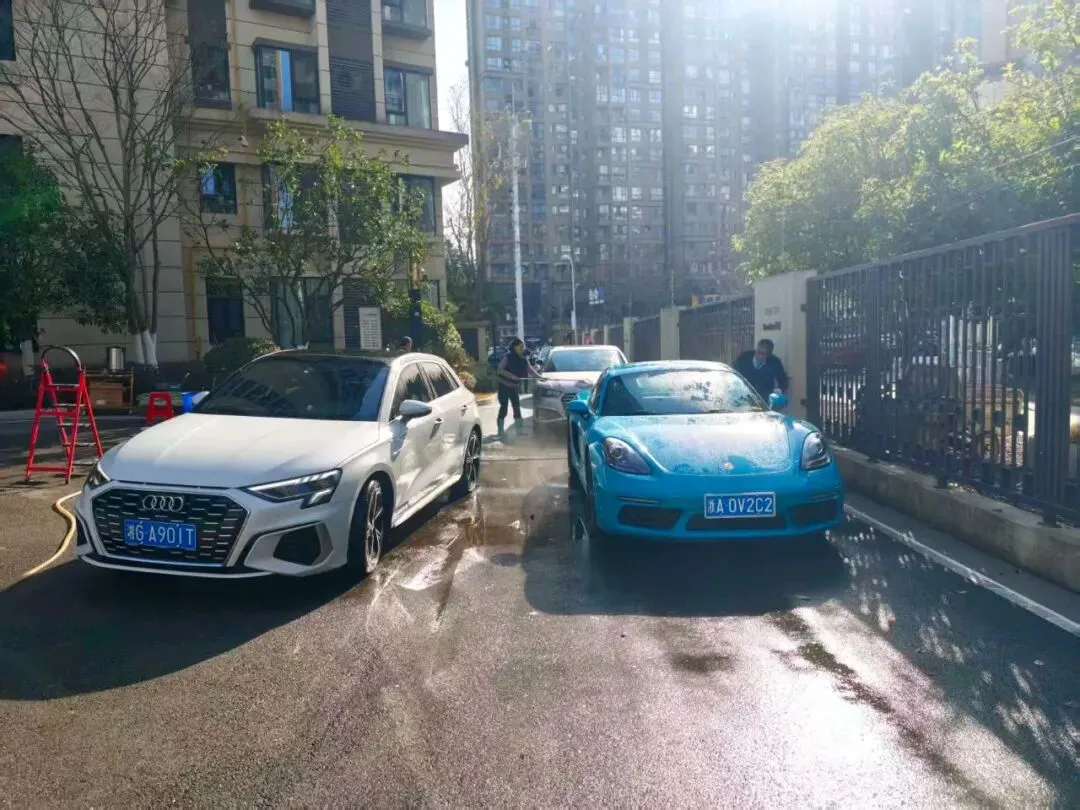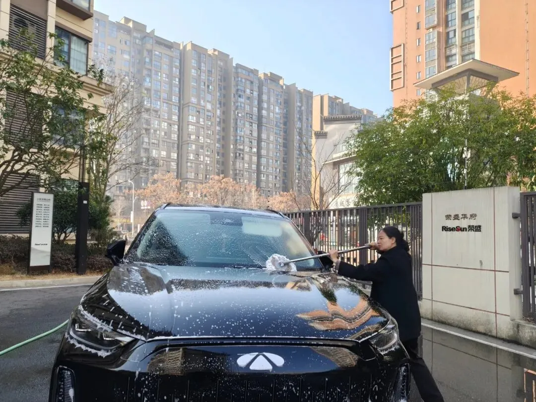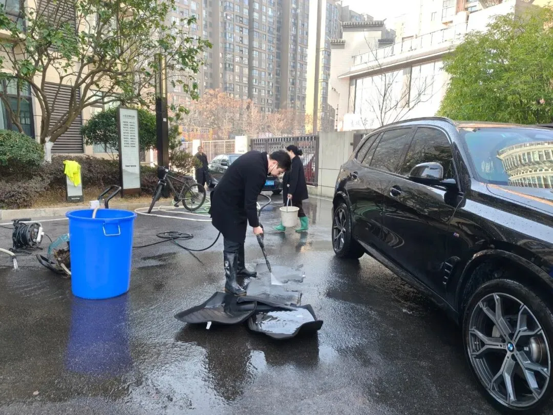 活动当天,洗车区域成为小区里最热闹的“打卡点”——物业工作人员化身“爱车守护者”,分工明确、默契配合:冲水湿车时动作轻柔,避免水花溅洒;打泡沫清洁剂时均匀细致,不留死角;刷洗车身时格外用心,呵护每一处车漆。