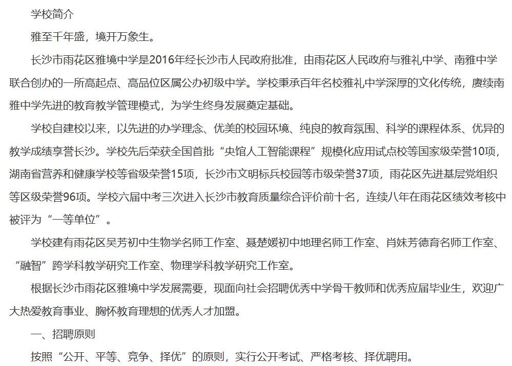 长沙市雨花区雅境中学春季合同制教师招聘公告