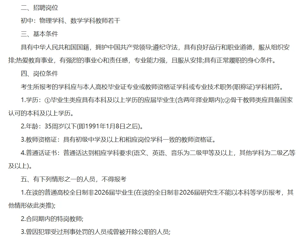 初中物理、初中化学、初中英语、初中体育各若干名。