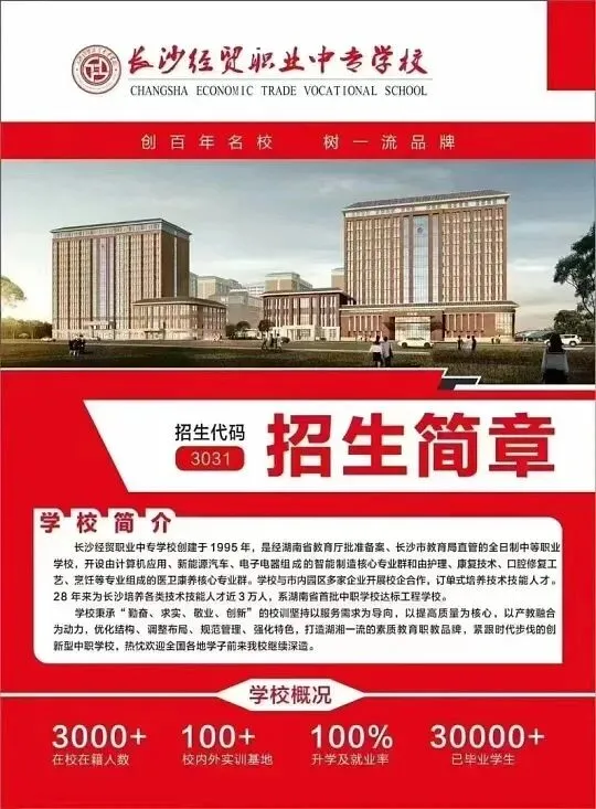 长沙经贸职业中专学校创建于1995年,是经长沙市教育局主管、湖南省教育厅备案的全日制中等职业学校,也是湖南省示范性中职学校与中职德育先进单位。学校坐落于长沙经开区,毗邻高校,交通便捷,拥有设施齐全的教学楼、实训楼、高标准田径场等教学生活设施,组建了由全国职教名师、省市技能大师引领的优质师资队伍,开设智能制造、医卫康养、现代服务三大核心专业群及多个特色专业,推行“工学交替+订单培养”模式,为学子搭建了畅通的升学与就业双通道。