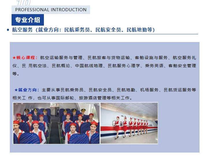 航空服务专业聚焦空乘、机场地勤方向,适配长沙黄花机场等枢纽人才缺口。课程体系涵盖民航概论、客舱服务规范、航空法规、安全检查实操等,配备波音737客舱模拟器等高端实训设备,还原真实工作场景。专业师资团队85%以上具备民航从业经历,定期邀请南方航空等企业骨干到校授课。报考空乘方向需女生身高≥162cm、男生≥172cm,地勤方向女生≥160cm、男生≥170cm,无色盲色弱。毕业生多入职海南航空、黄花机场等单位,起薪高于行业平均水平,升学通道可对接民航类高职院校。