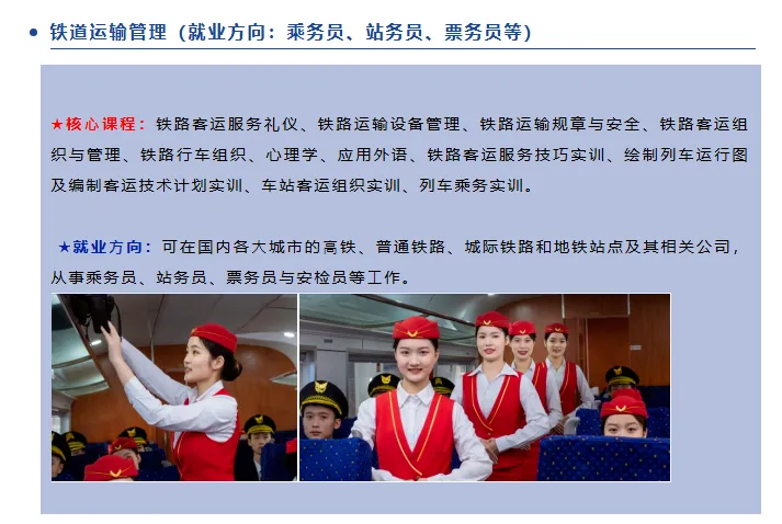铁道运输服务专业为学校王牌专业,精准对接高铁乘务、铁路物流等岗位需求。核心课程涵盖客运组织、铁路安全规范、高铁乘务礼仪、应急处置等,兼顾理论与实操。