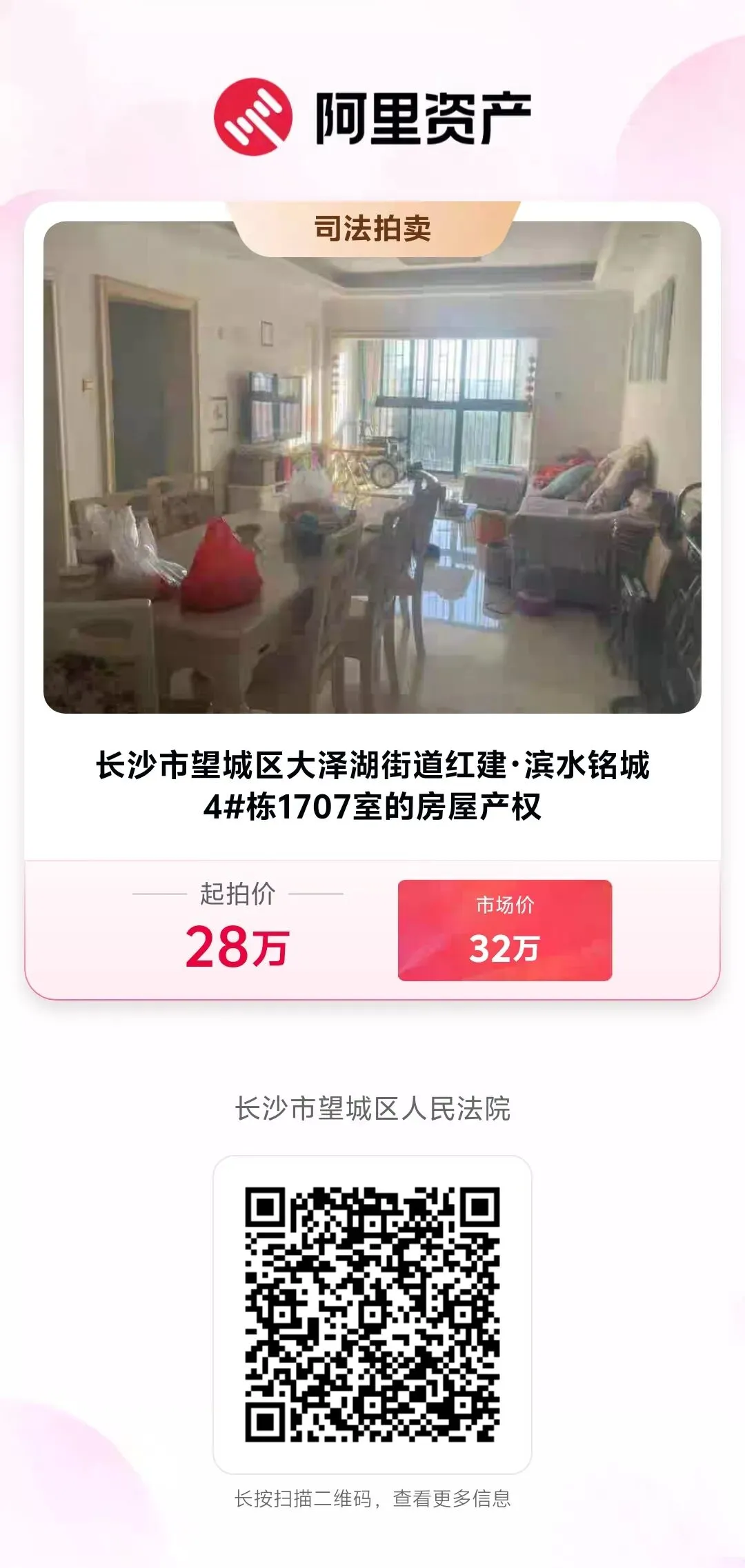 长沙市望城区大泽湖街道红建·滨水铭城4#栋1707室的房屋产权将于2026年1月28日10:00时至2026年1月29日10:00时(延时的除外)在长沙市望城区人民法院淘宝网司法拍卖网络平台上(http://sf.taobao.com/0731/09,户名:长沙市望城区人民法院)第二次进行公开拍卖活动。