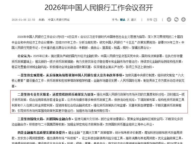 2026年中国人民银行工作会议近期召开,会议总结2025年工作成效,部署年度重点任务并研究 “十五五” 改革发展规划。