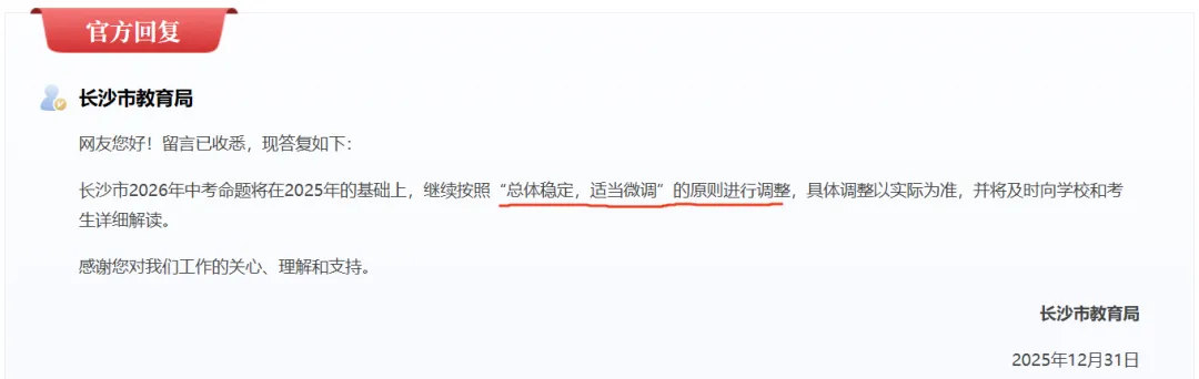 长沙家长必看! 2026年长沙中考长沙依然单独命题,且试题结构按照“总体稳定,适当微调”的原则进行调整.